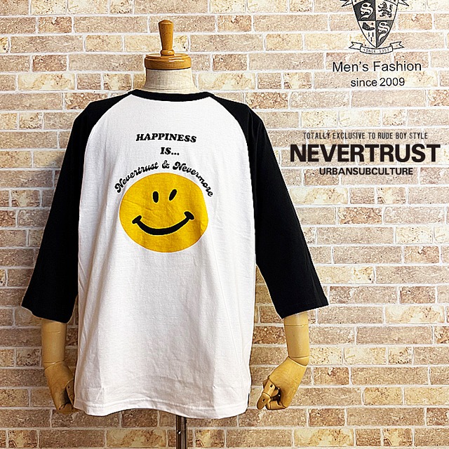 【ネバートラスト】HAPPINESSラグラン7分袖Tシャツ カラー:ホワイト/ブラック