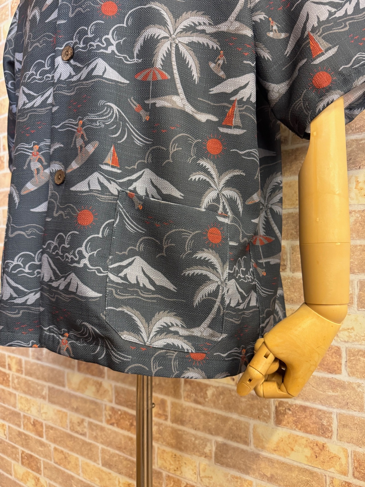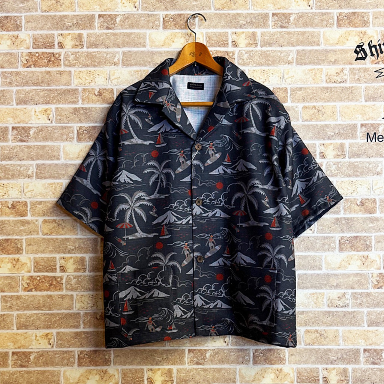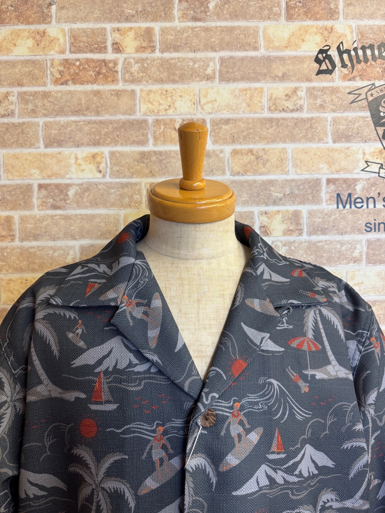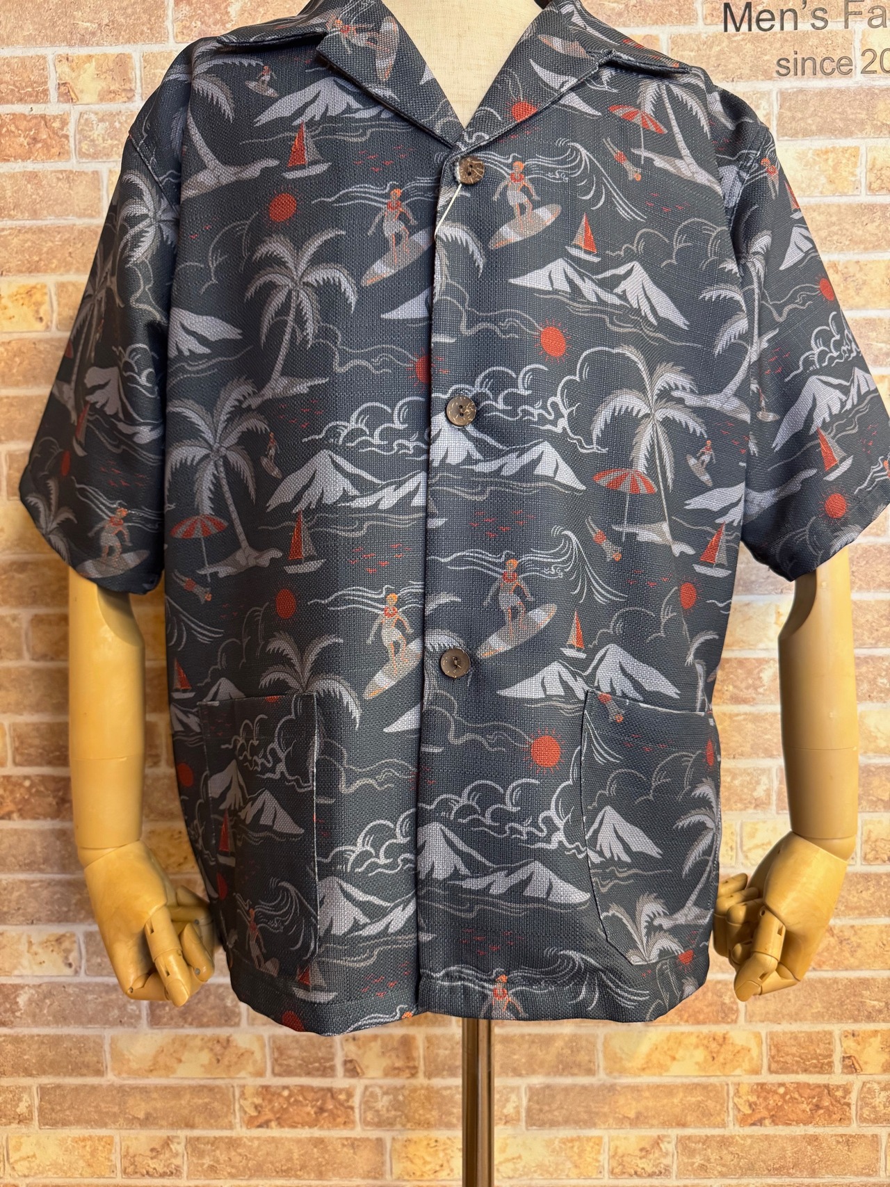 【モデムデザイン】オールオーバーアロハパターンビーチシャツ カラー:チャコールグレー