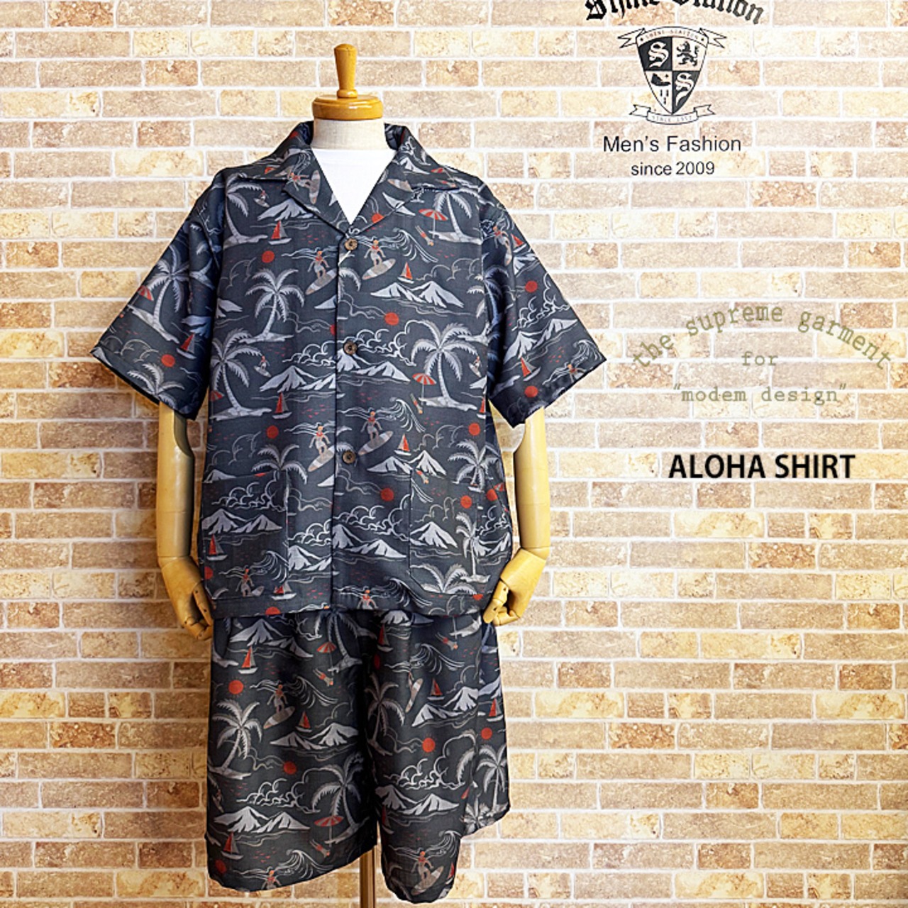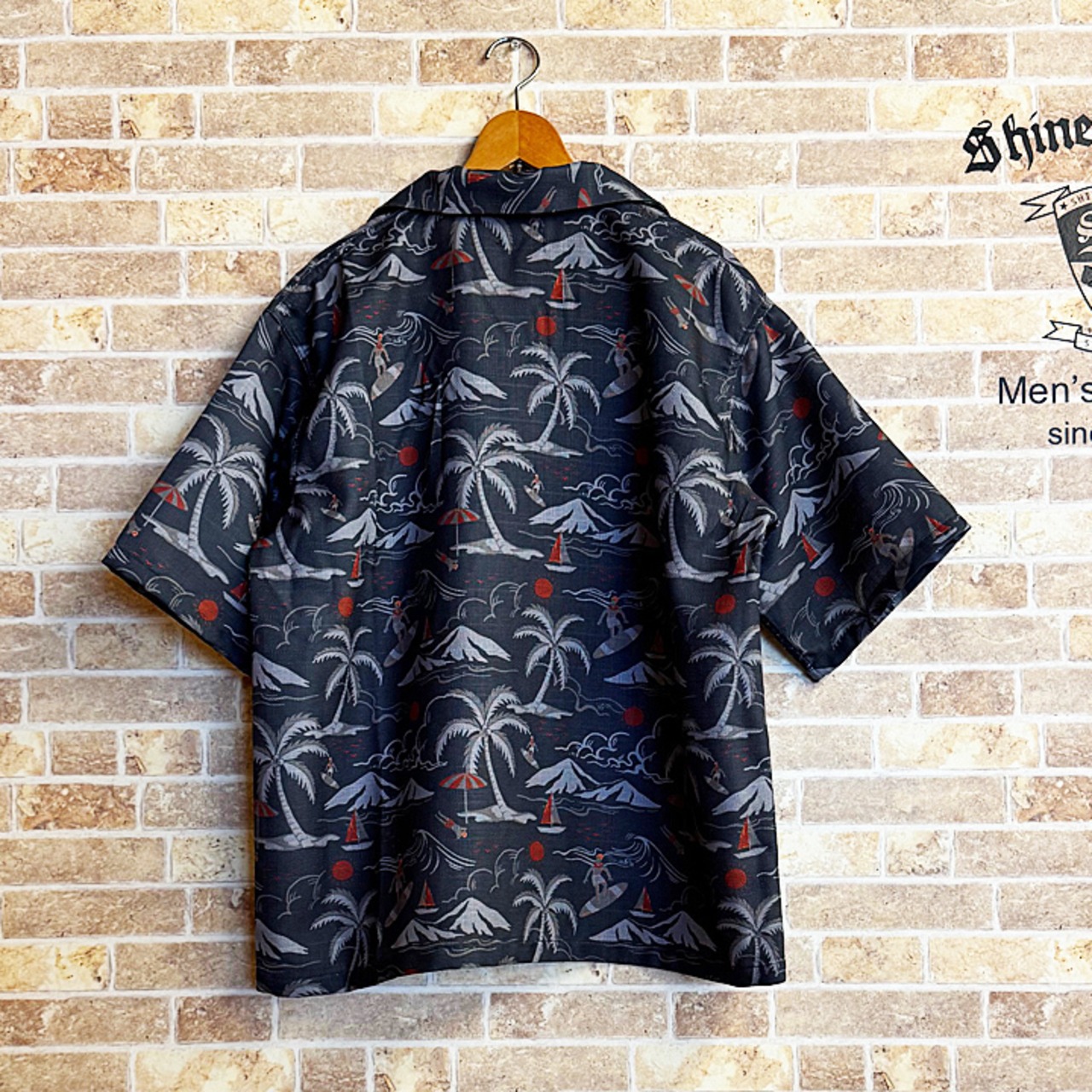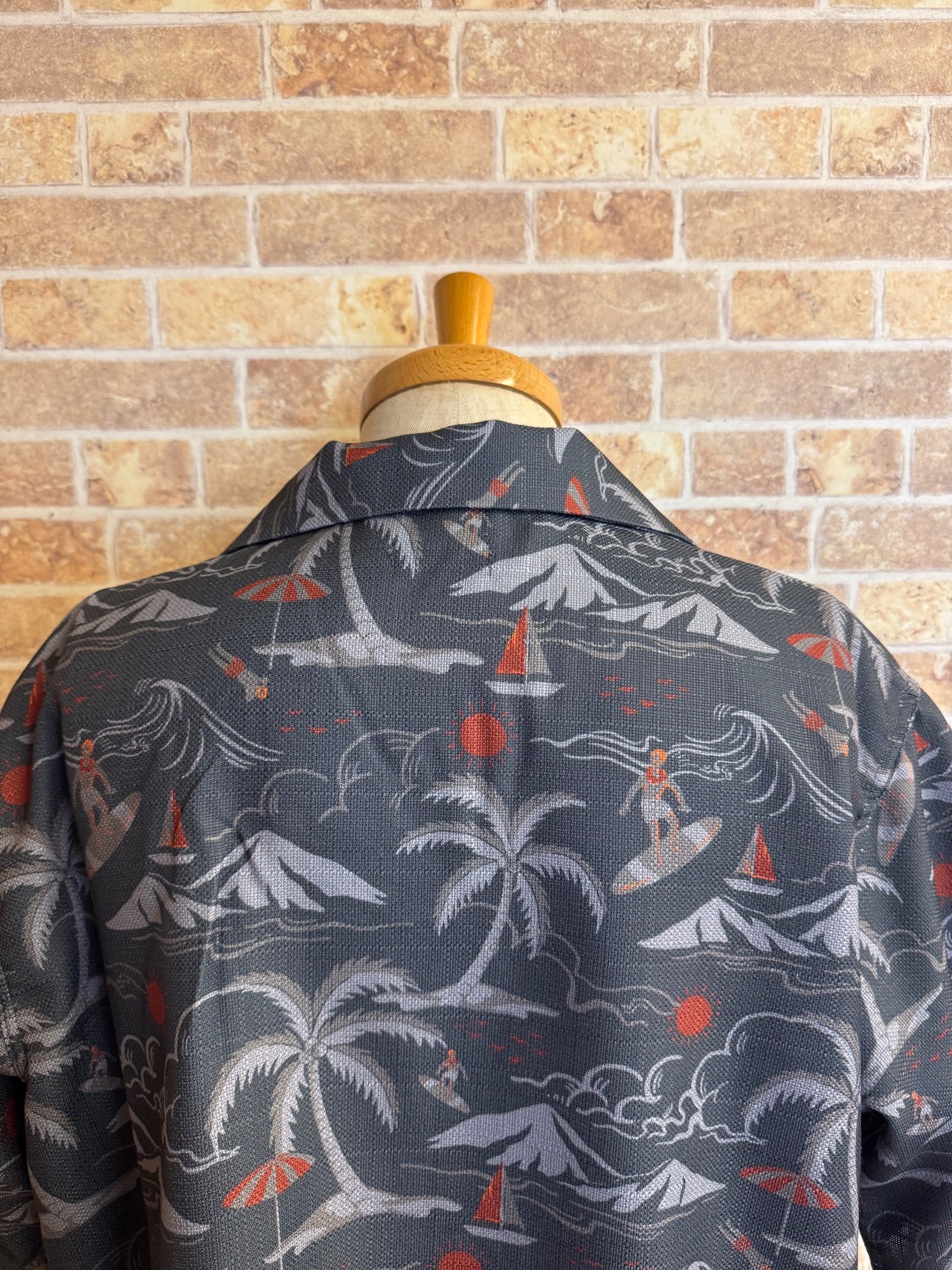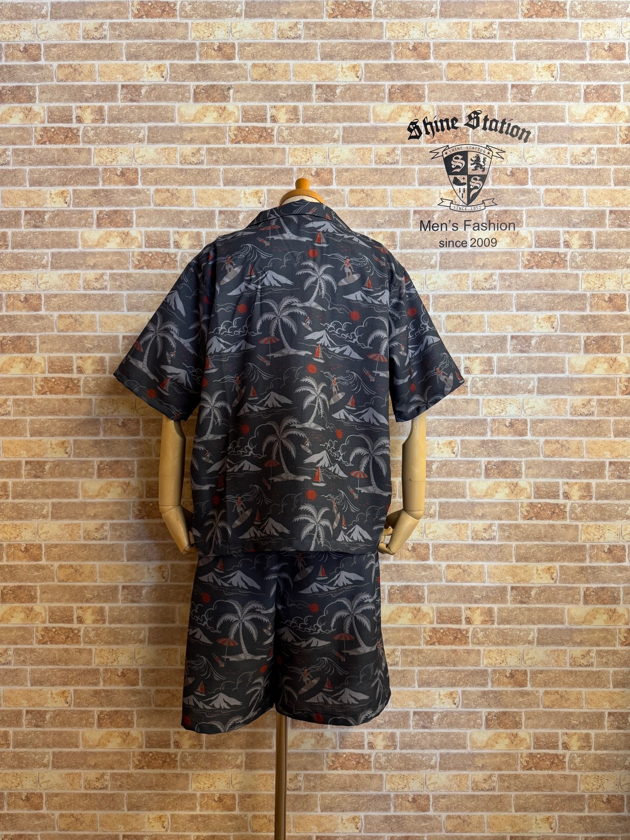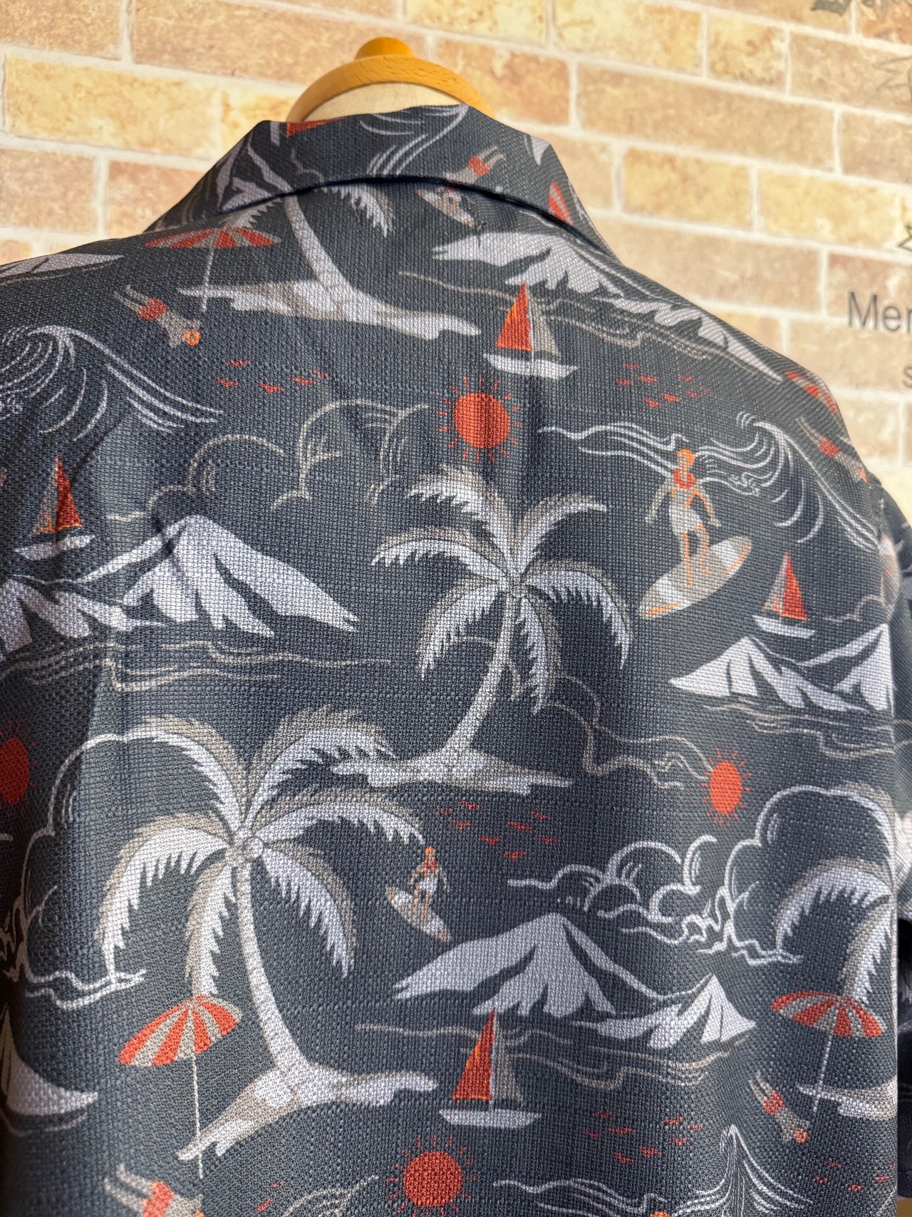 【モデムデザイン】オールオーバーアロハパターンビーチシャツ カラー:チャコールグレー