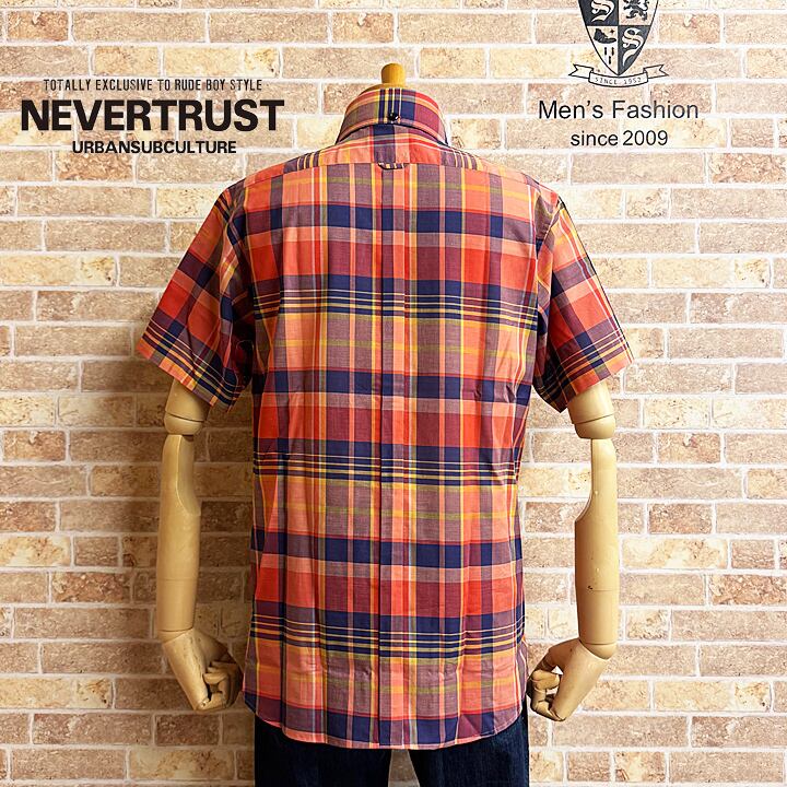 【ネバートラスト】マドラスチェック半袖ボタンダウンシャツ カラー:オレンジチェック