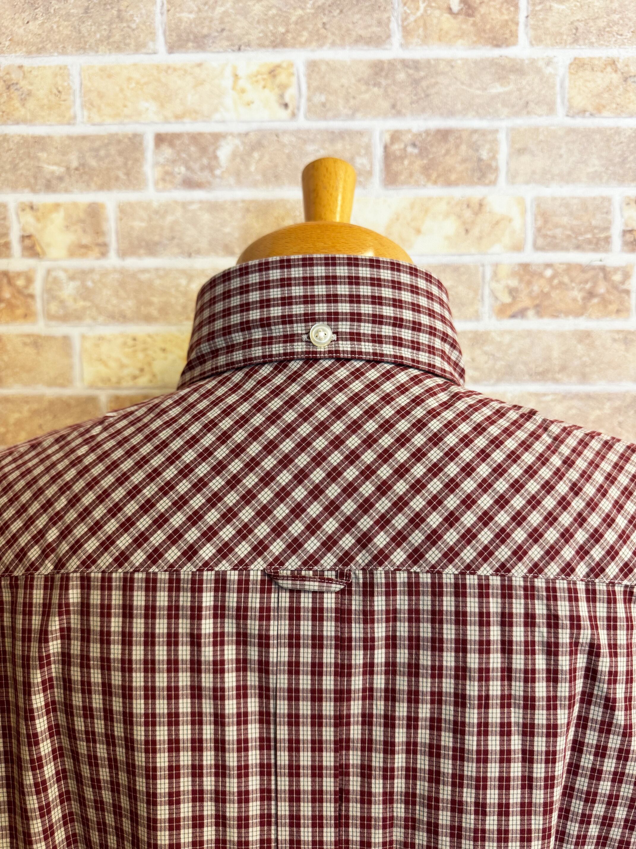 深みのあるバーガンディーとオフホワイトのトラディショナルなミニチェックのボタンダウンシャツになります