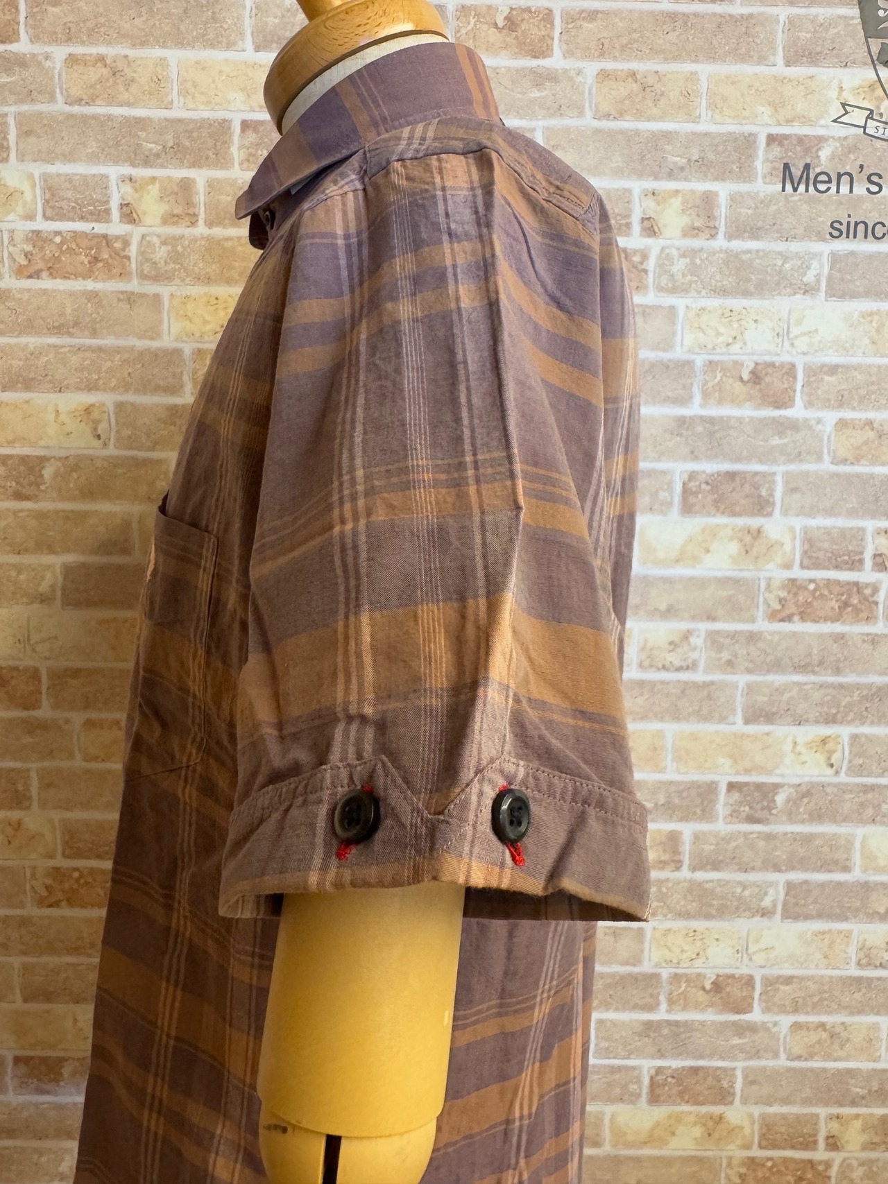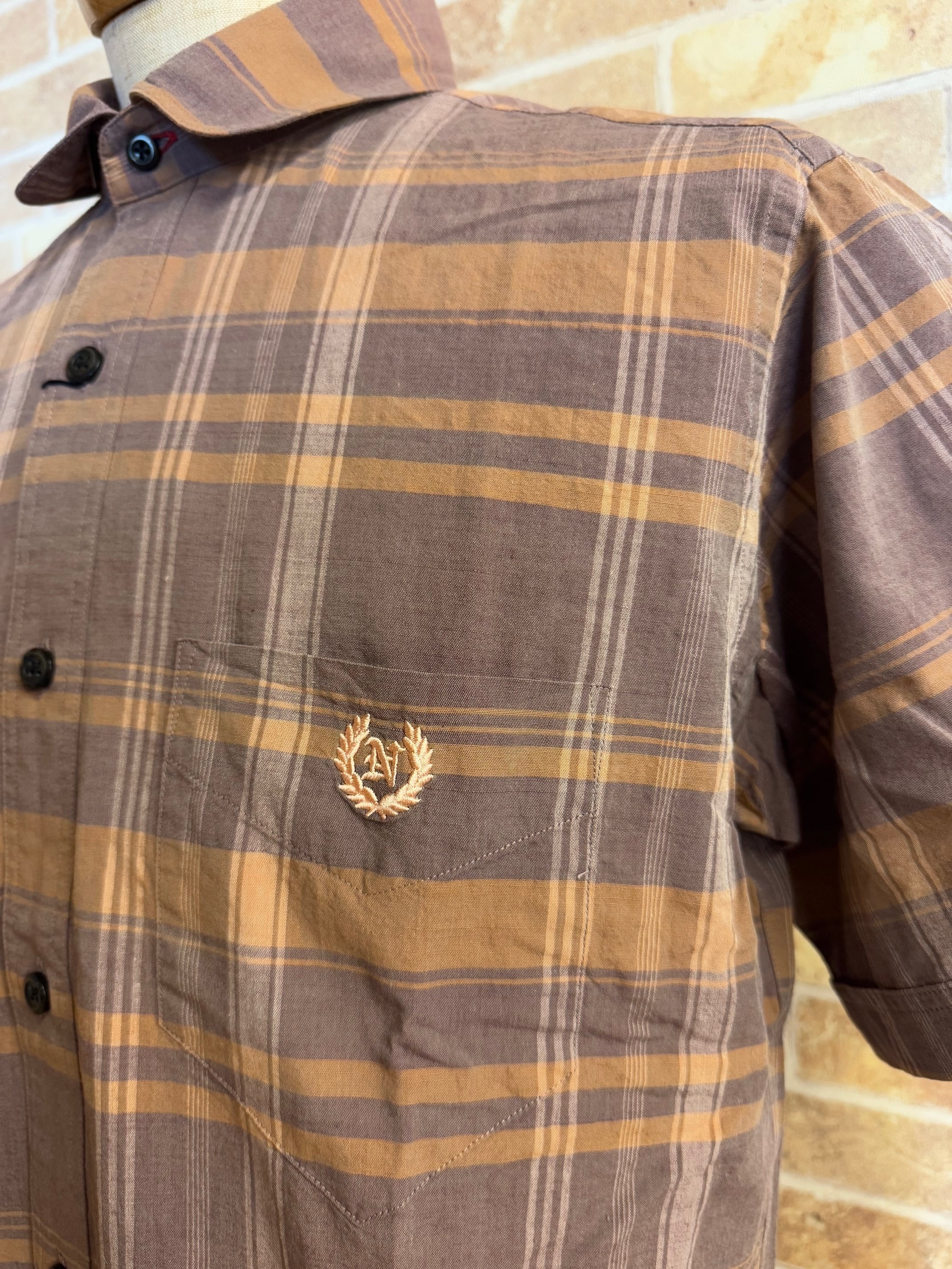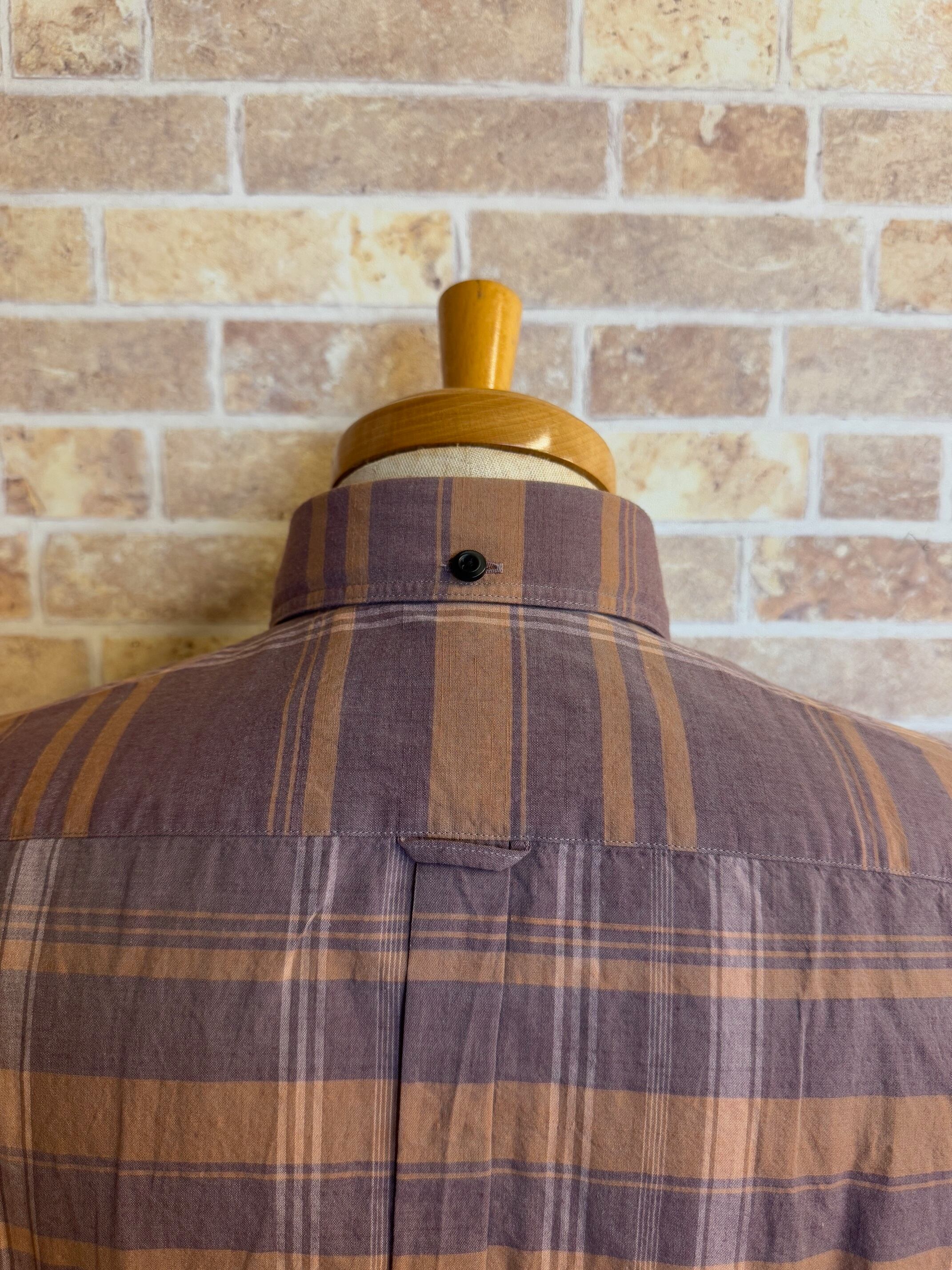 軽快な印象のアースカラーチェックのショートラウンドカラー半袖ボタンダウンシャツになります。