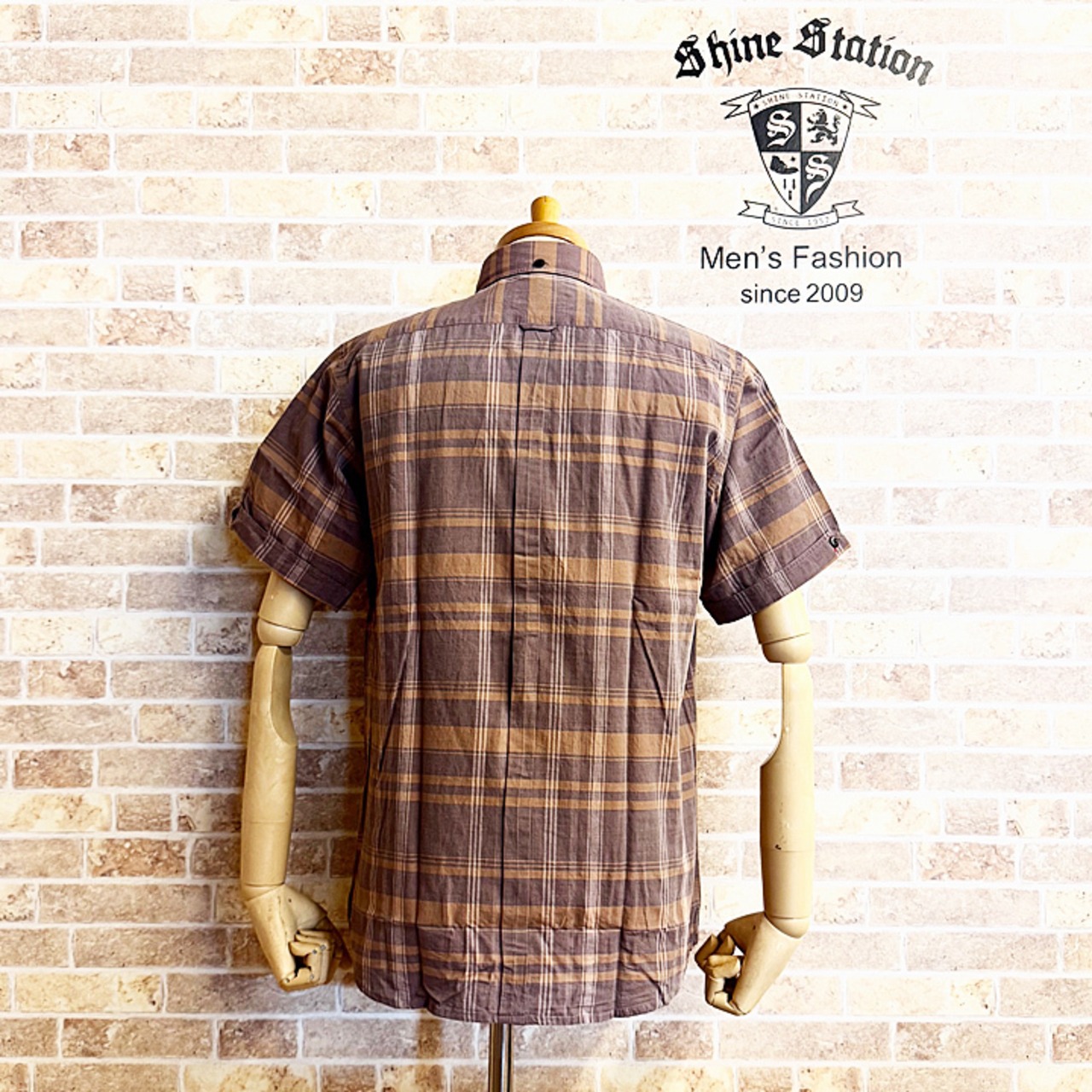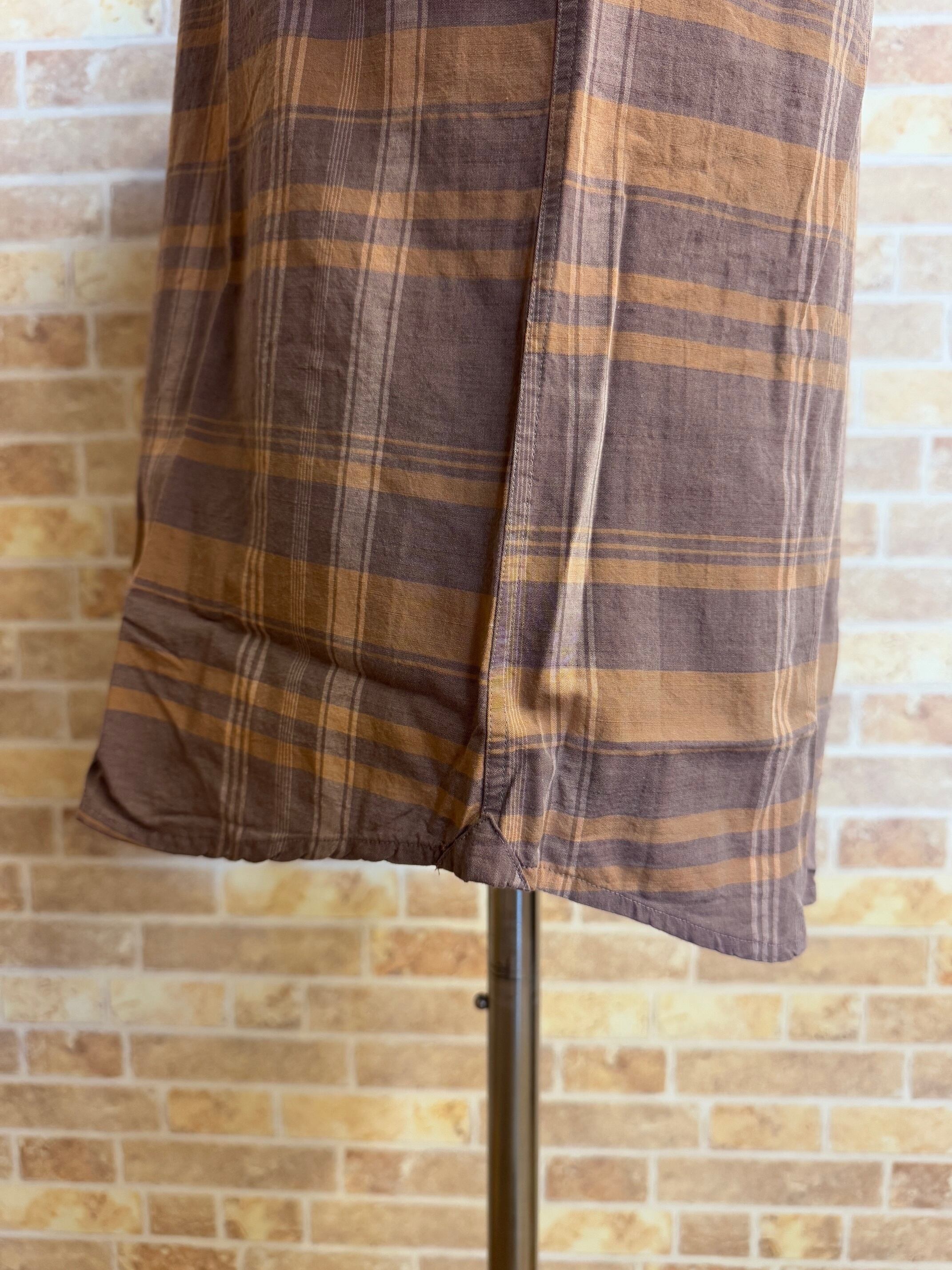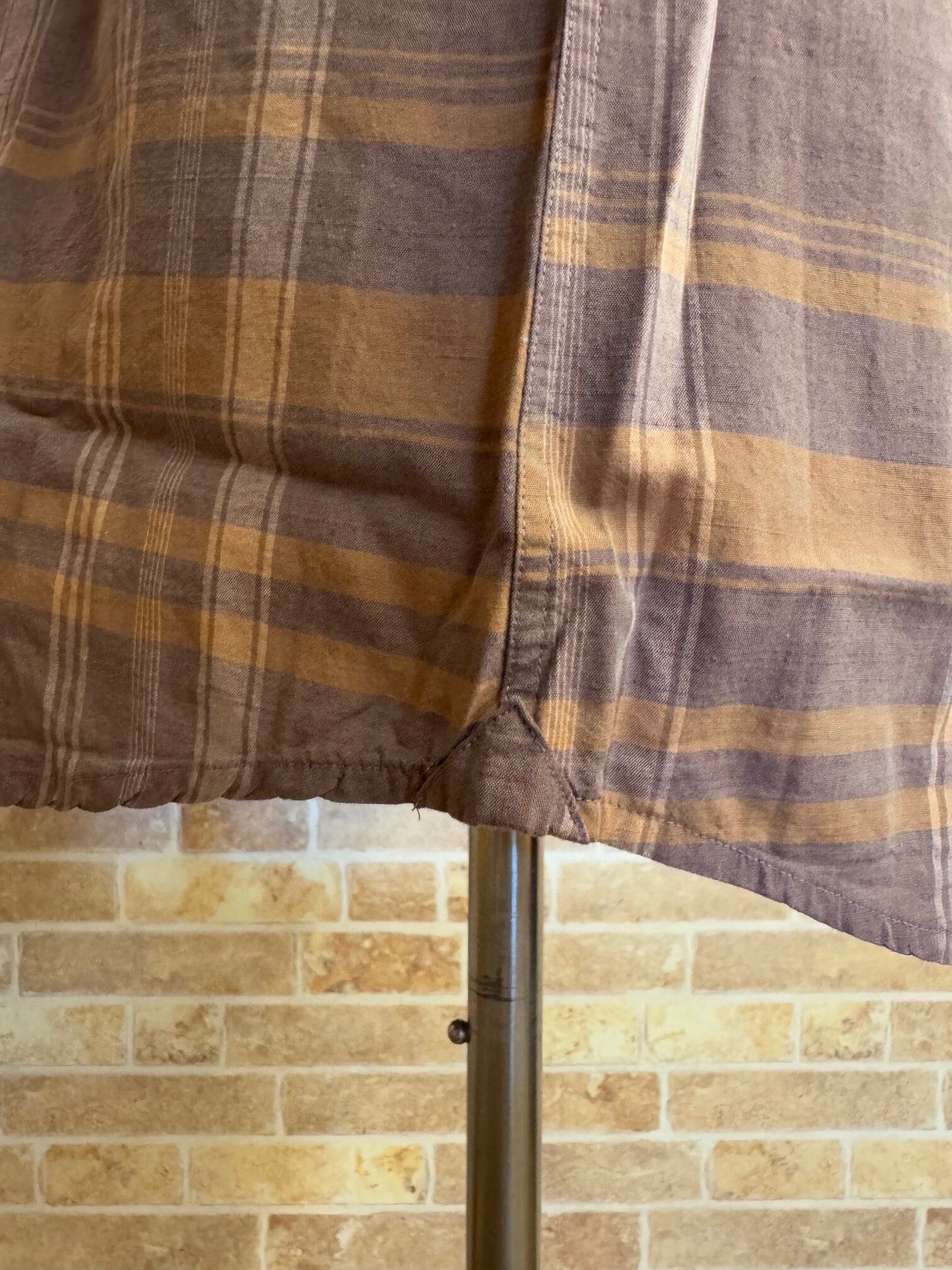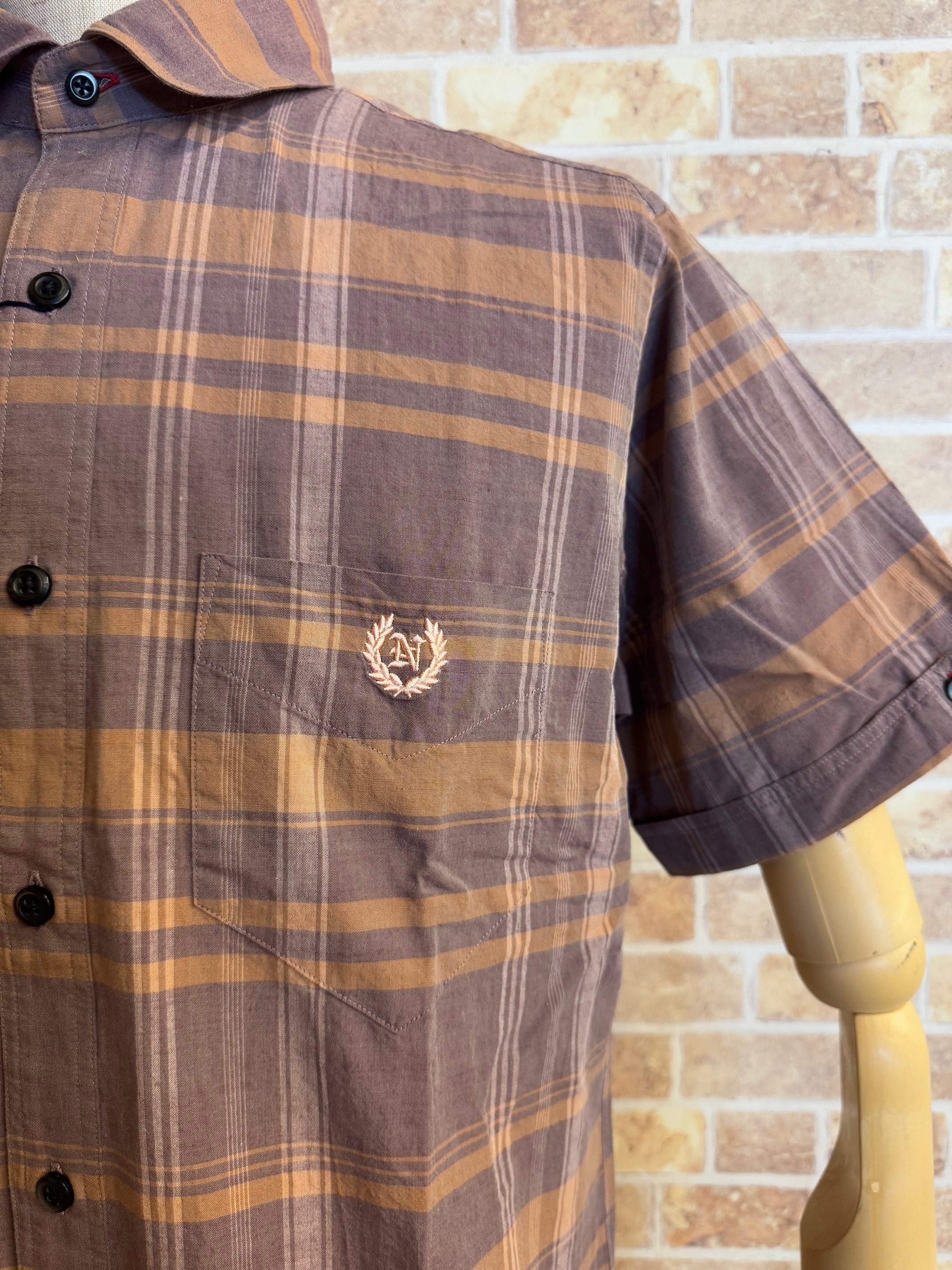 軽快な印象のアースカラーチェックのショートラウンドカラー半袖ボタンダウンシャツになります。