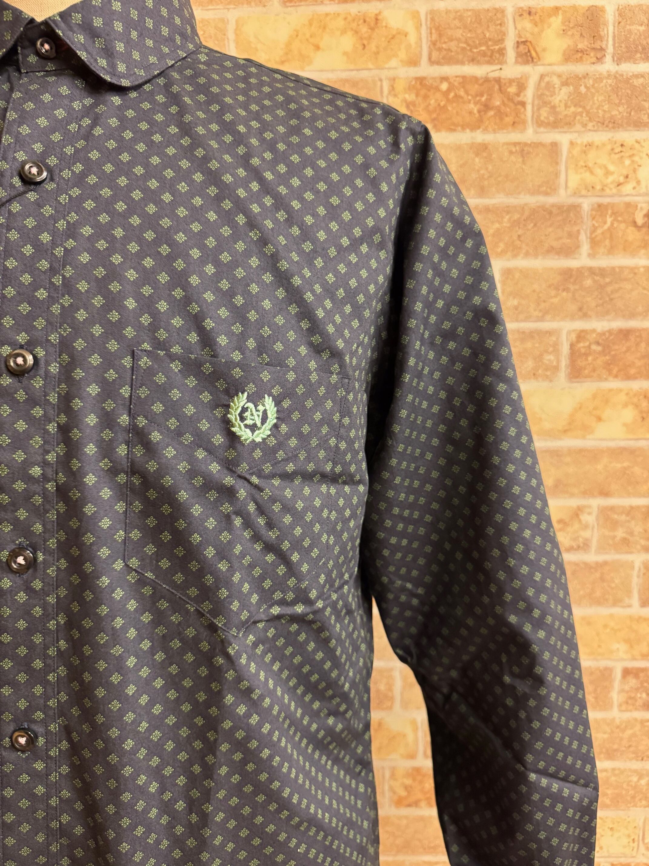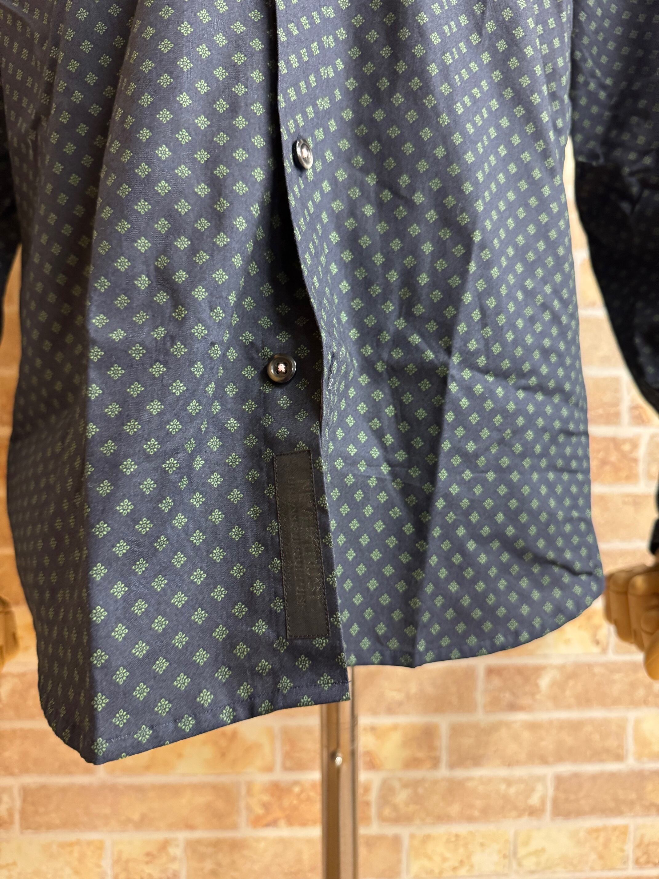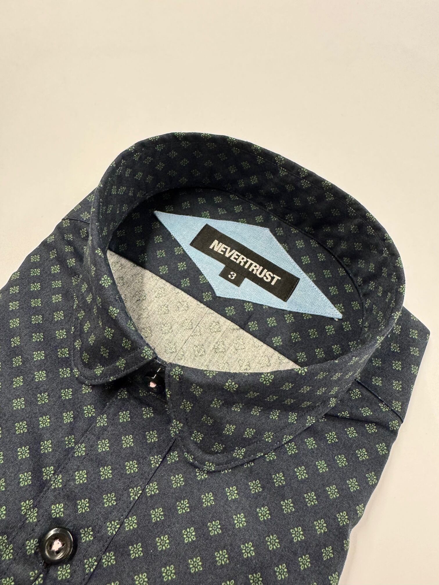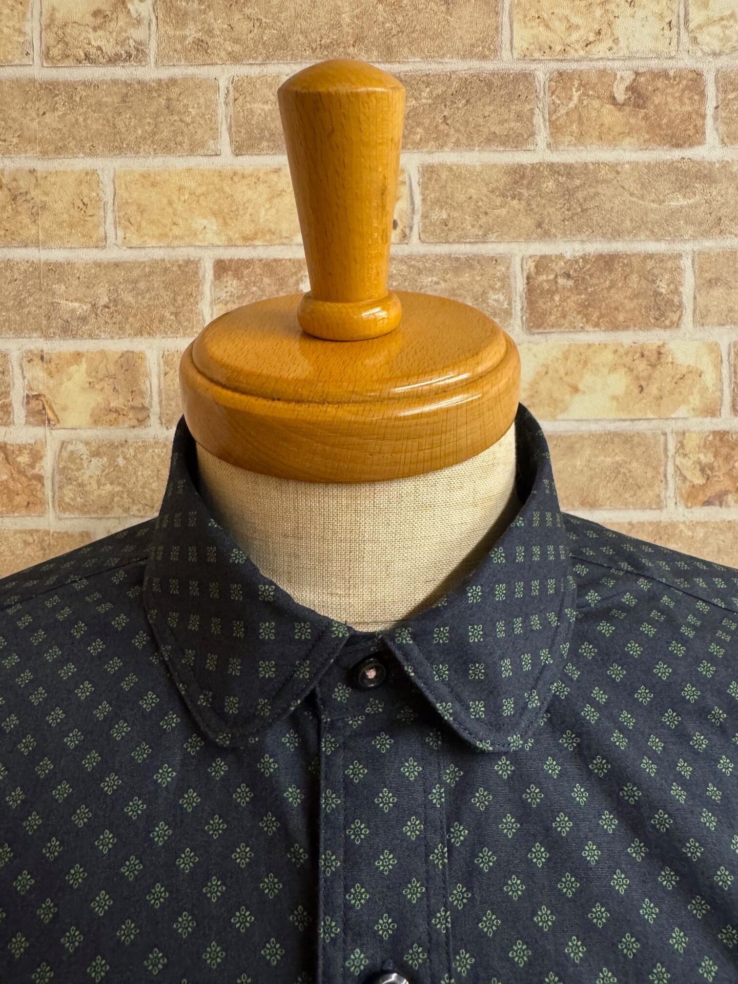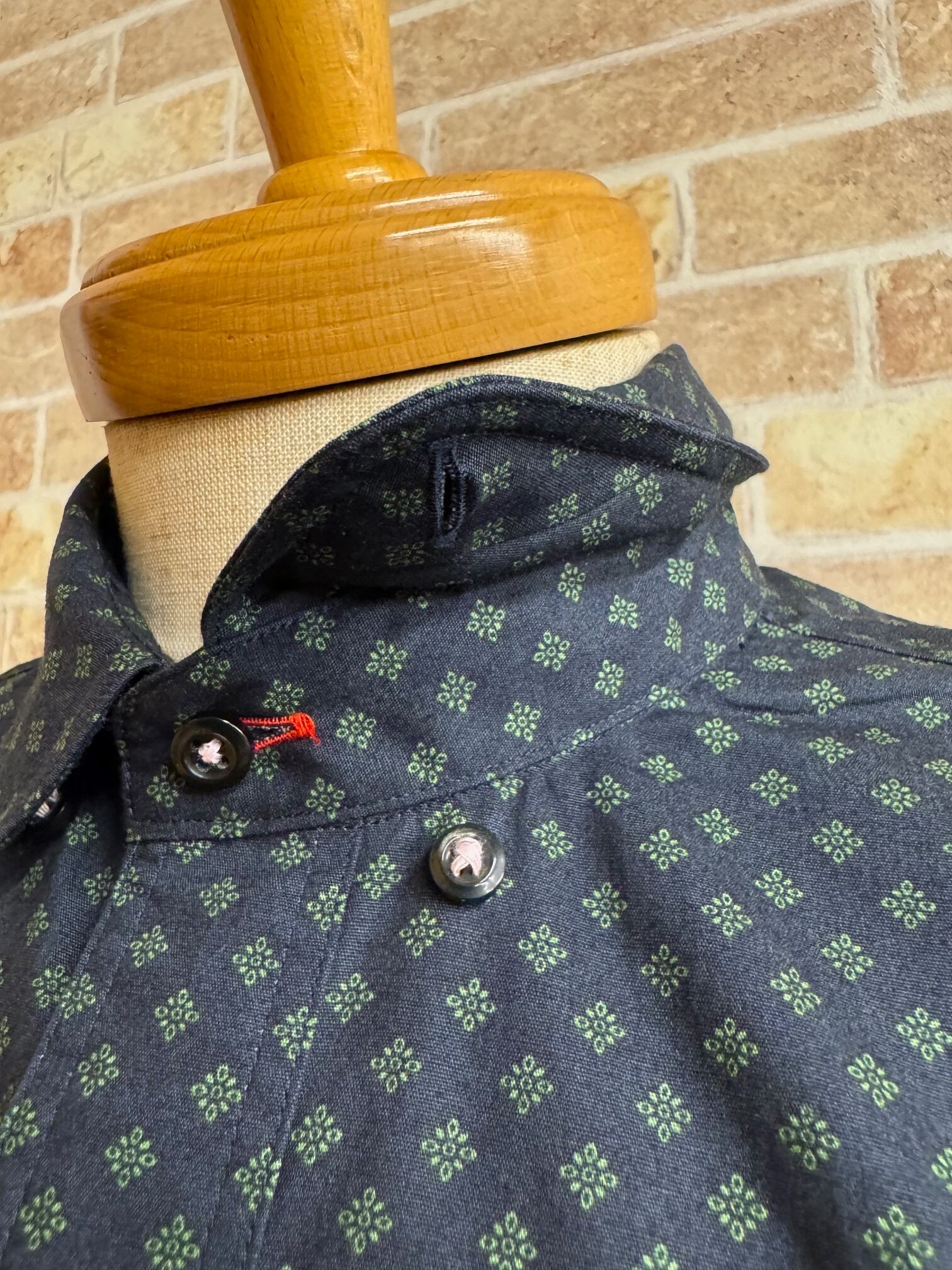 ネイビー地にグリーンの小花模様が映える小紋柄のシャツ。