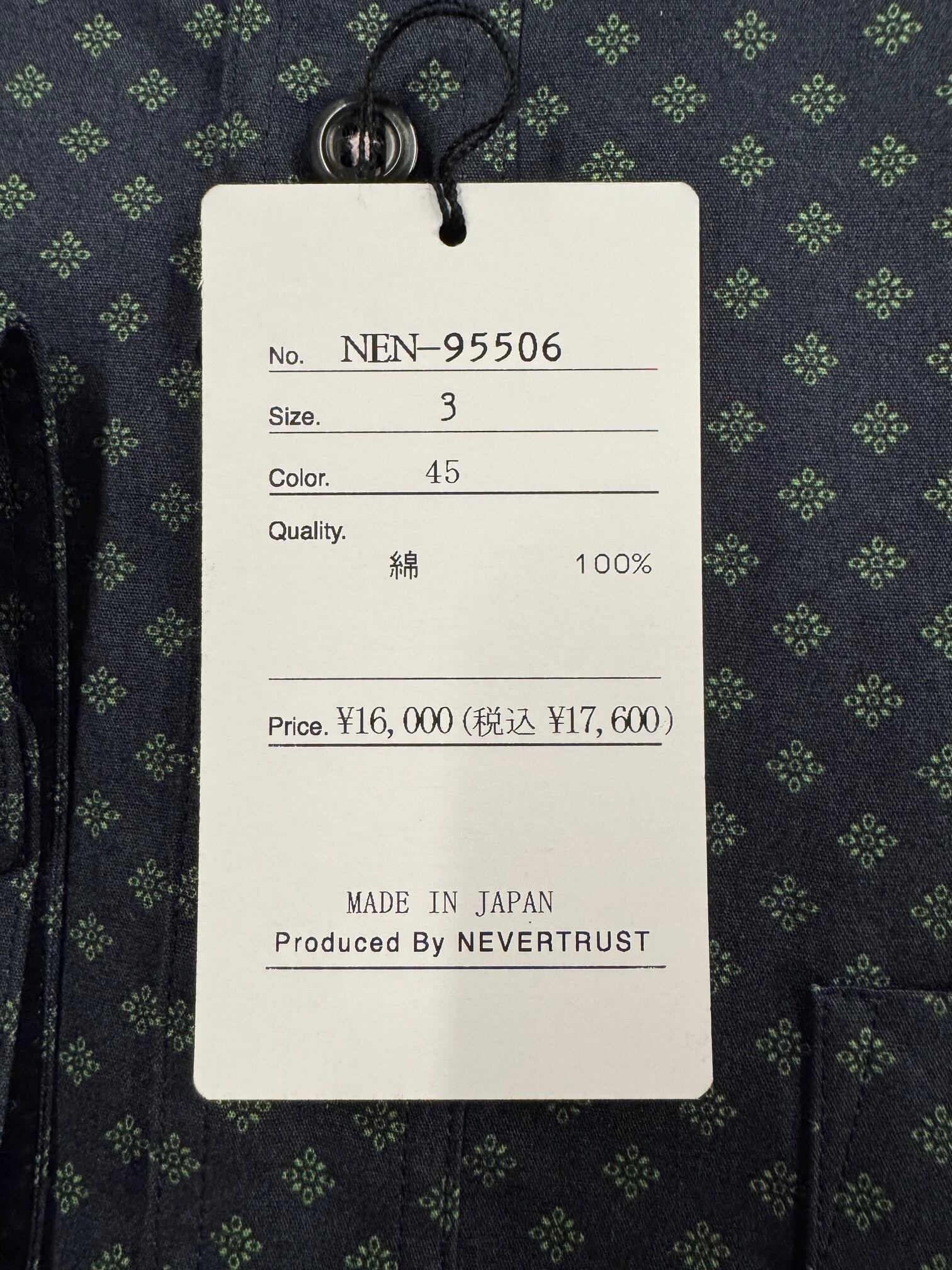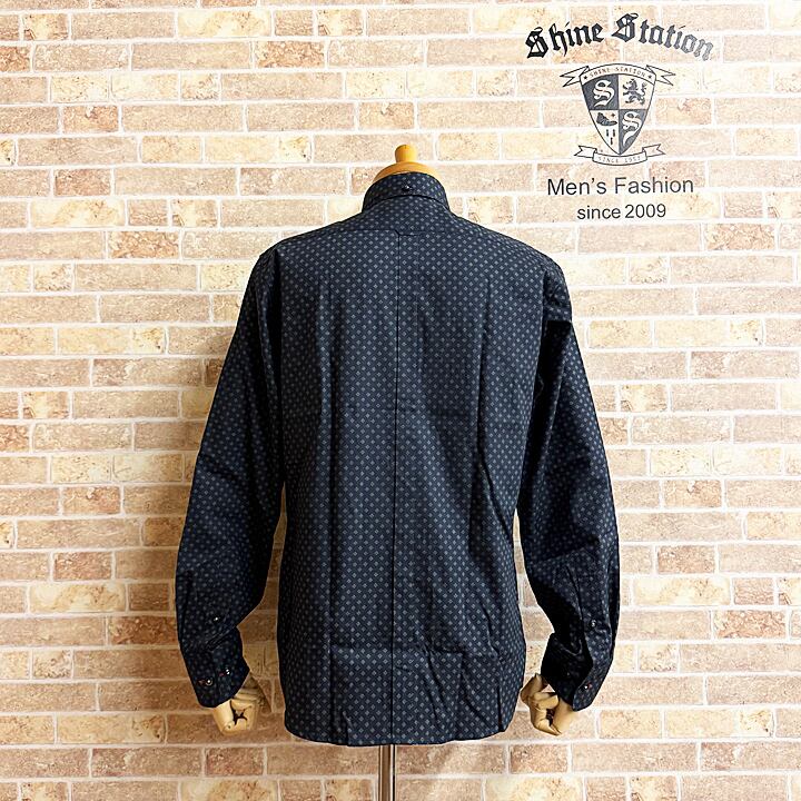 【ネバートラスト】小紋柄・ショートラウンド隠しボタンダウン長袖シャツ カラー:ネイビー