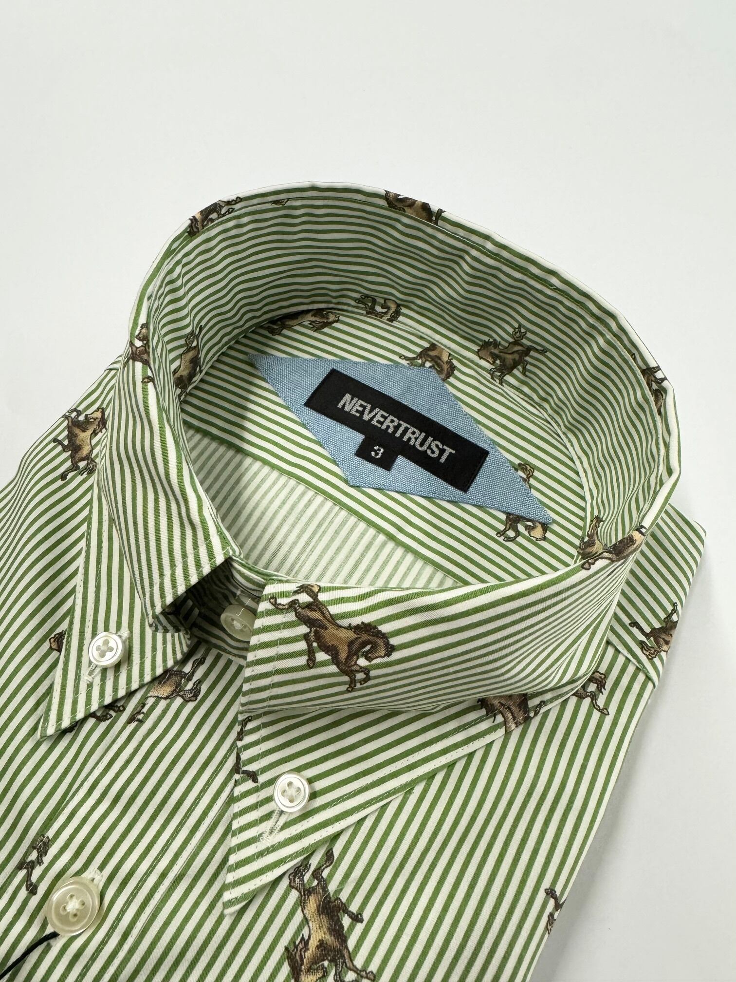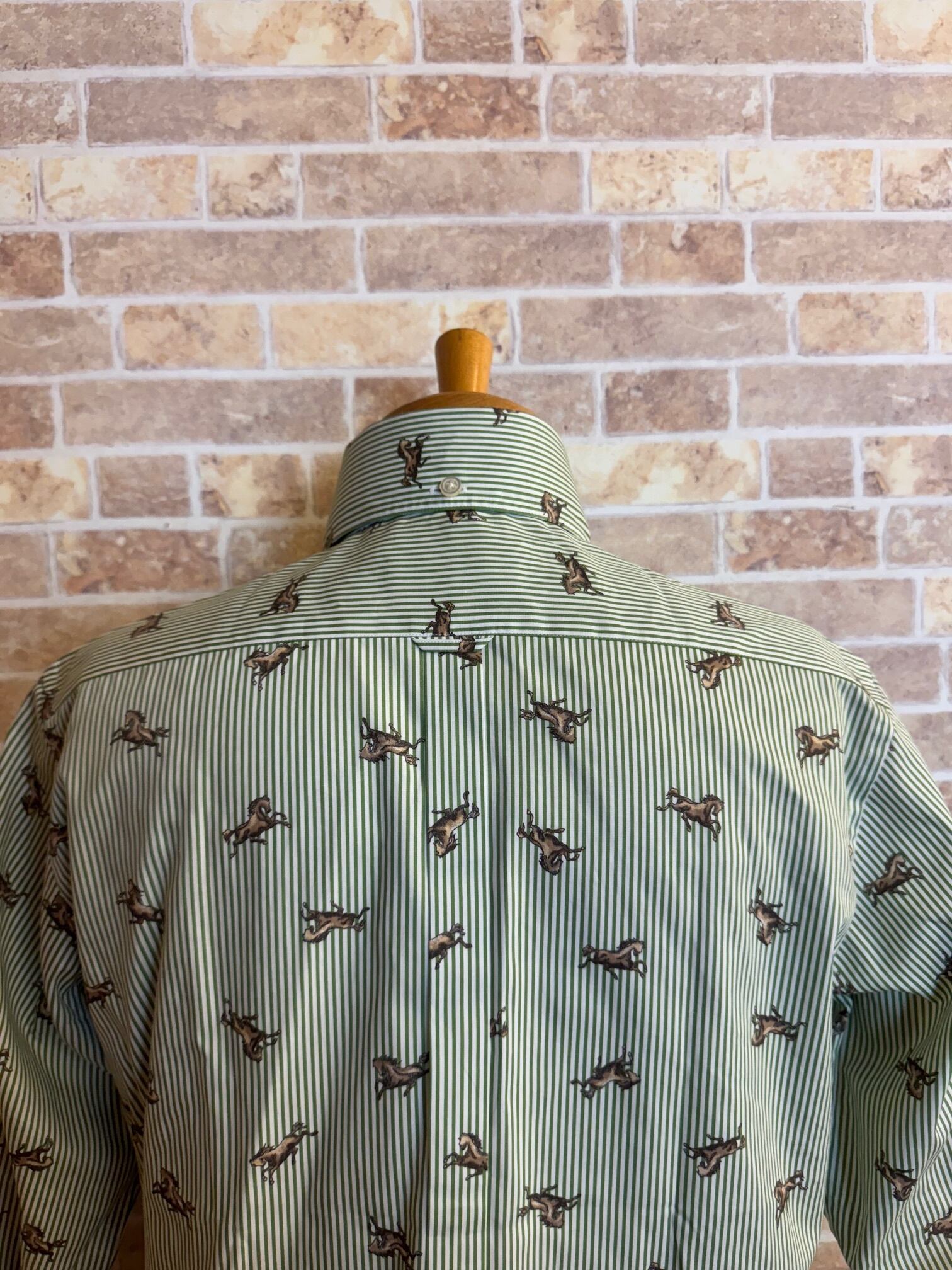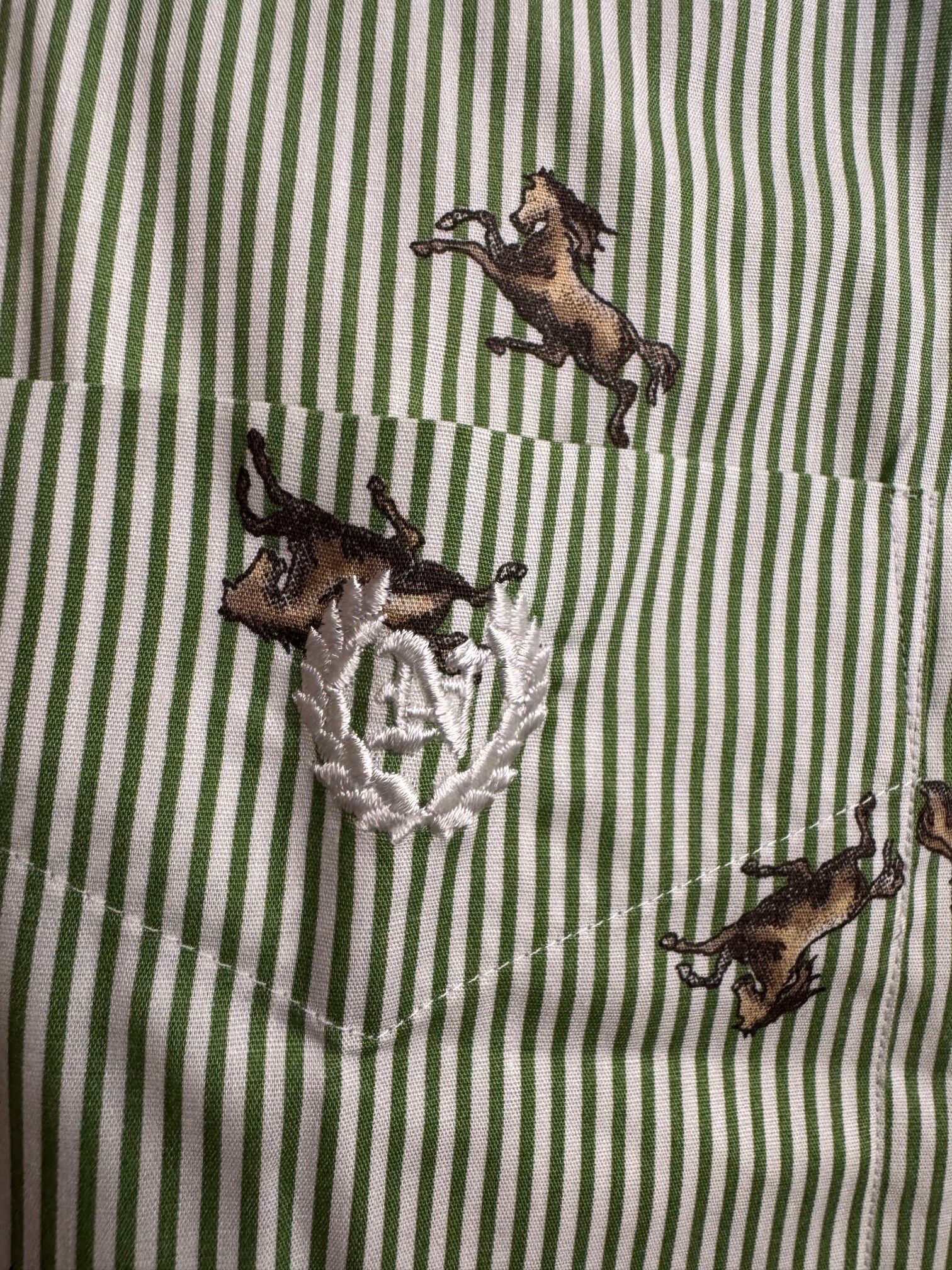 【ネバートラスト】ストライプ・ホース柄ボタンダウン長袖シャツ カラー:グリーン