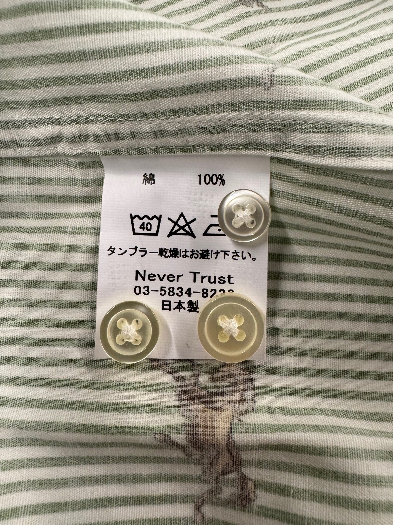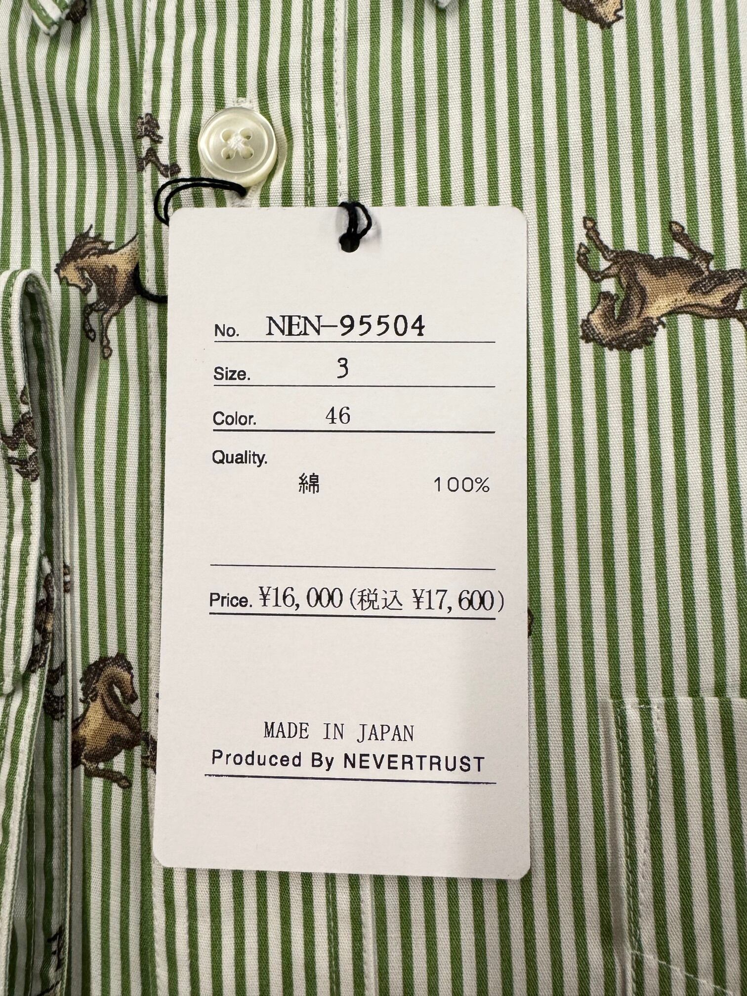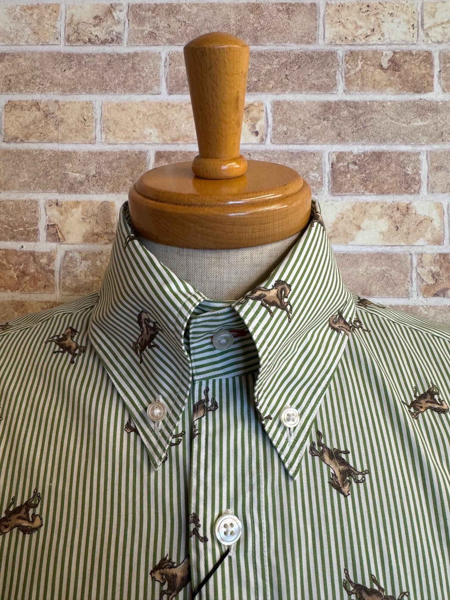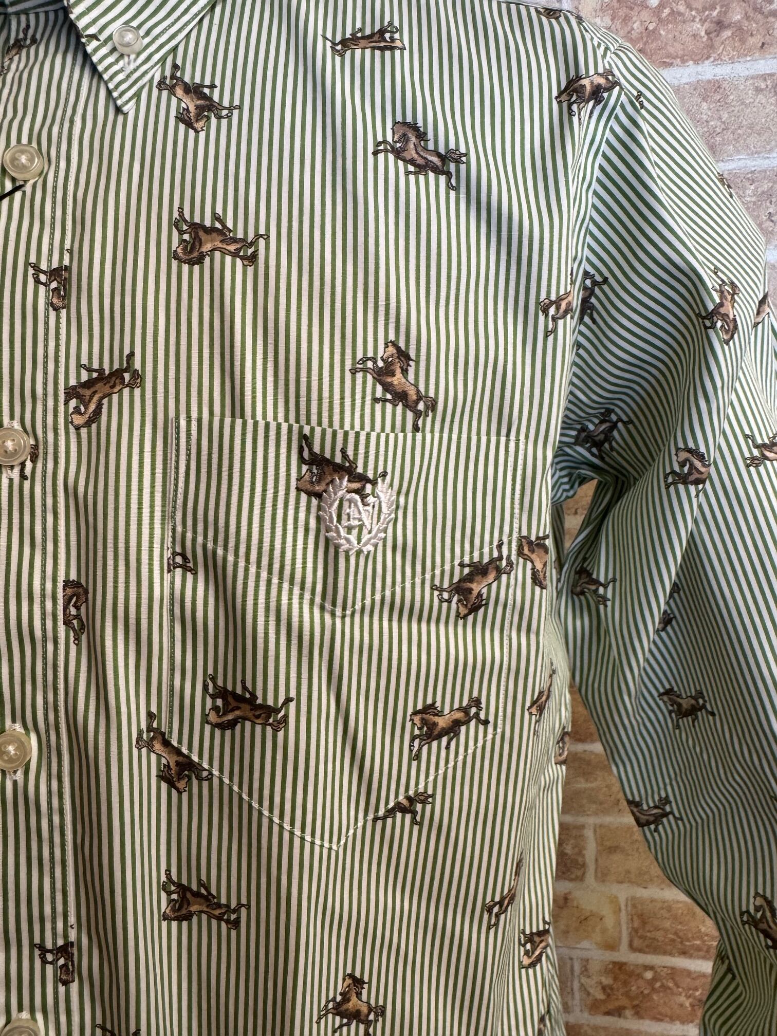 【ネバートラスト】ストライプ・ホース柄ボタンダウン長袖シャツ カラー:グリーン