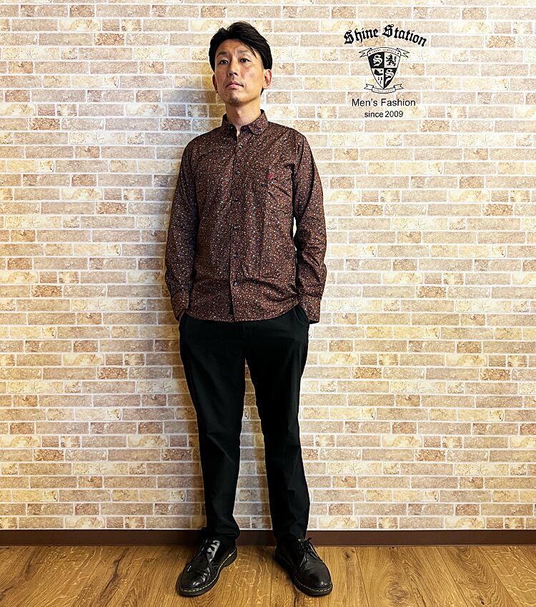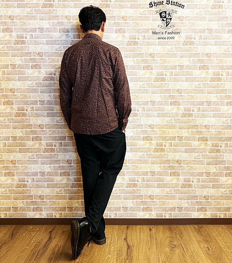 【ネバートラスト】ペイズリー・ショートラウンドカラー・隠しボタンダウン長袖シャツ カラー:ワイン