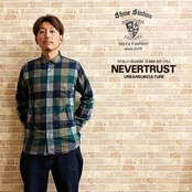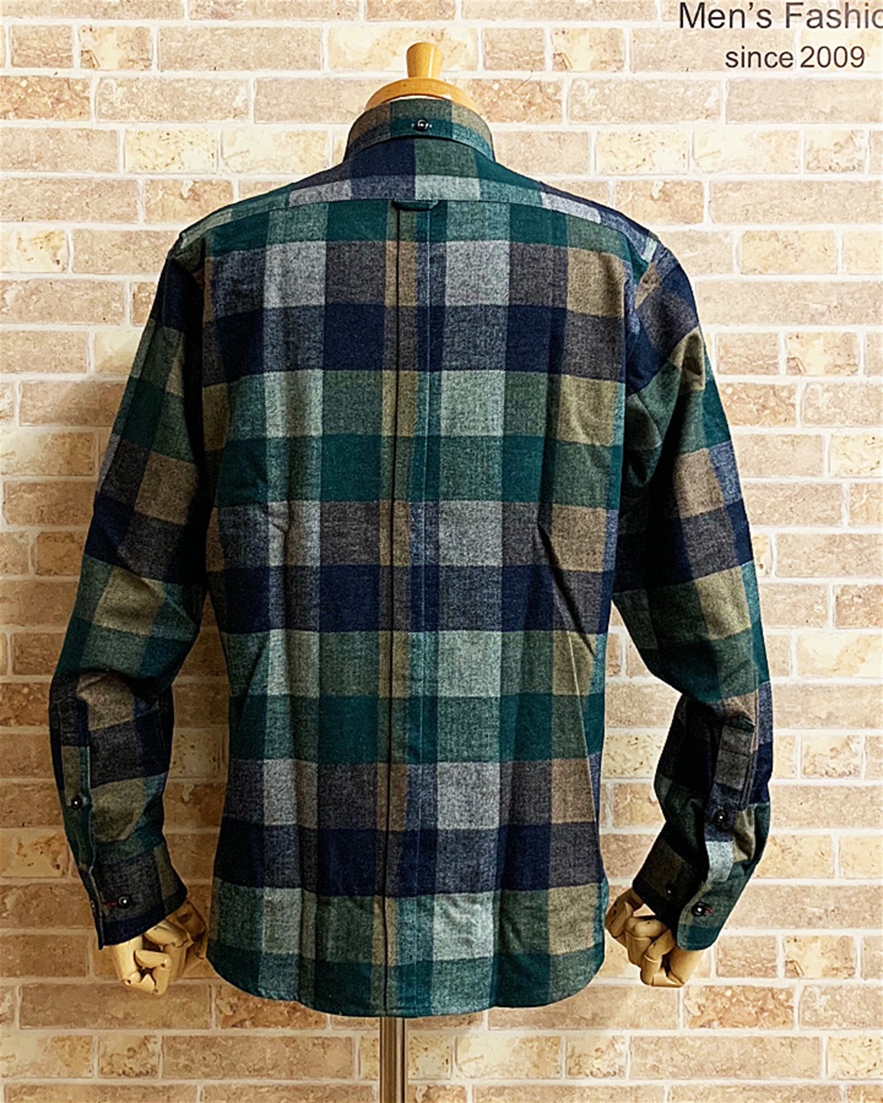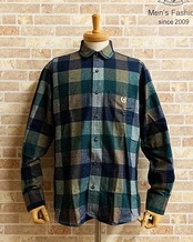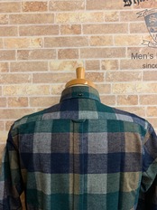 【ネバートラスト】ヘリンボーンブロックチェック・ショートラウンド比翼ボタンダウン長袖シャツ カラー:グリーン
