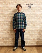 【ヘリンボーンブロックチェック・ショートラウンド比翼ボタンダウン長袖シャツ】
