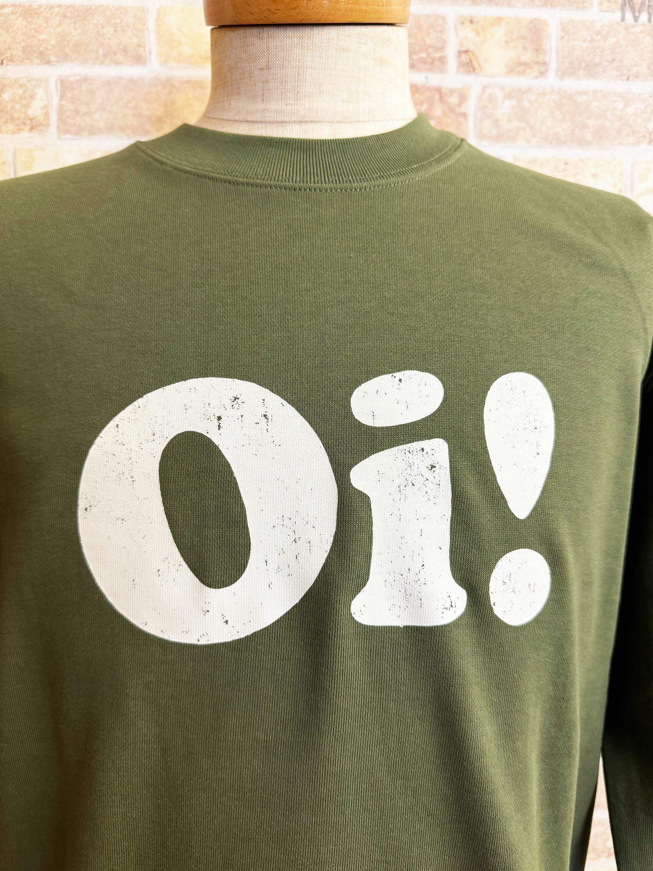 シンプルにフロントに「Oi!」のロゴプリントのクルーネックスウェット。