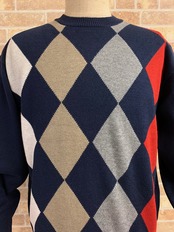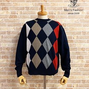 どこか懐かしさも感じられる、古着のような配色が魅力のダイヤ柄のクルーネック・セーターです。