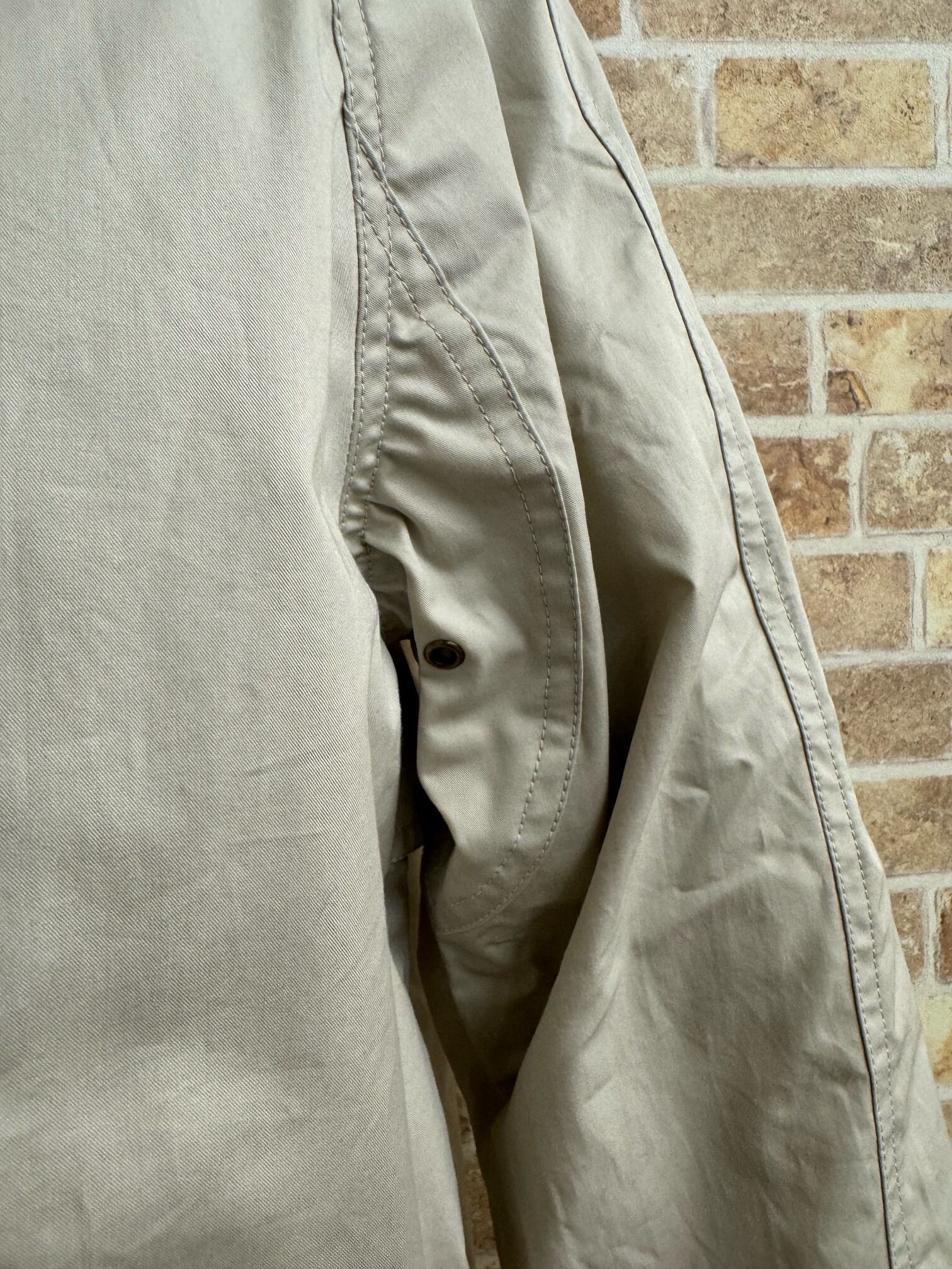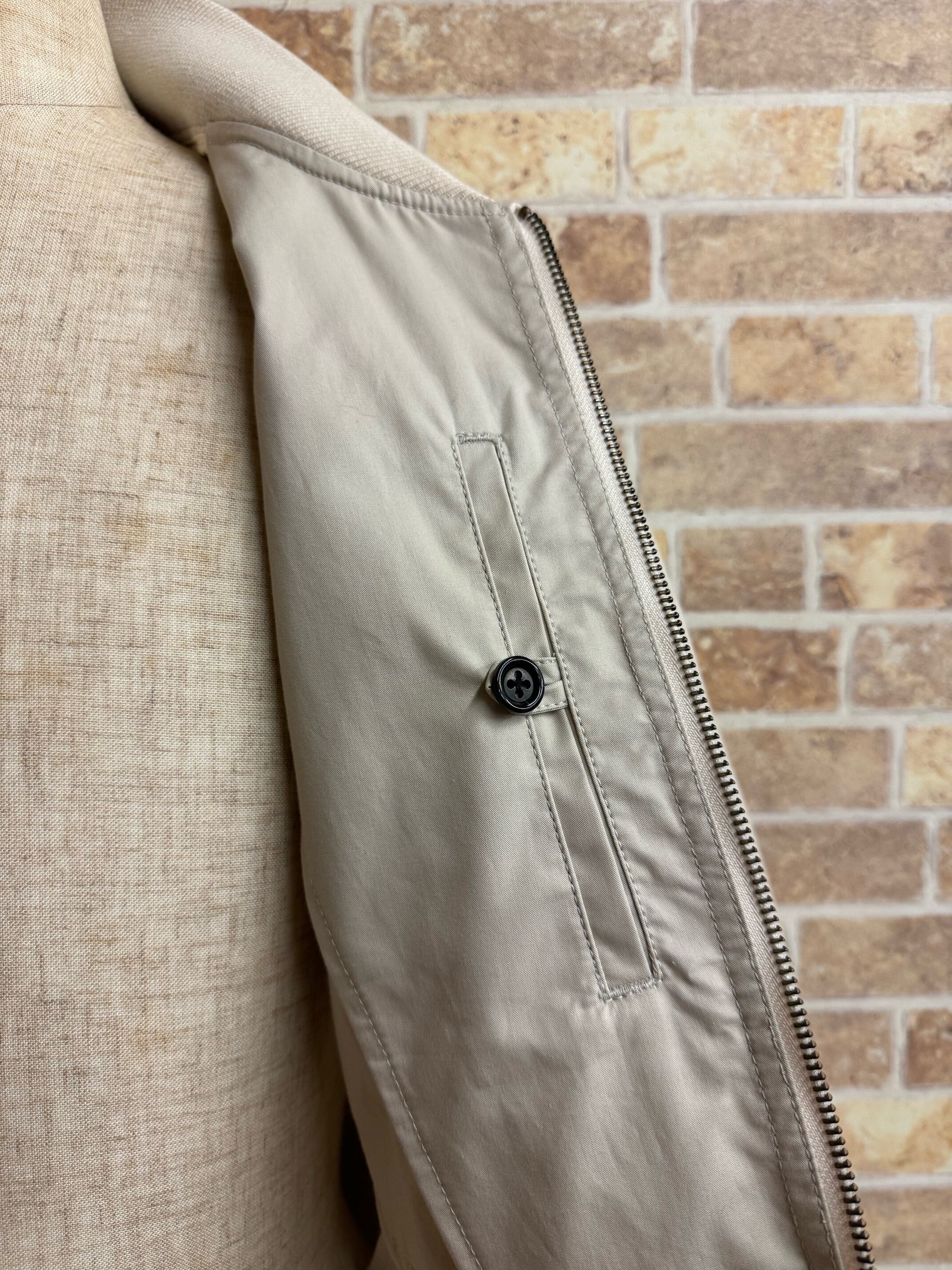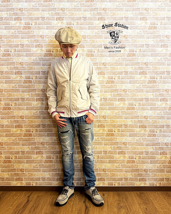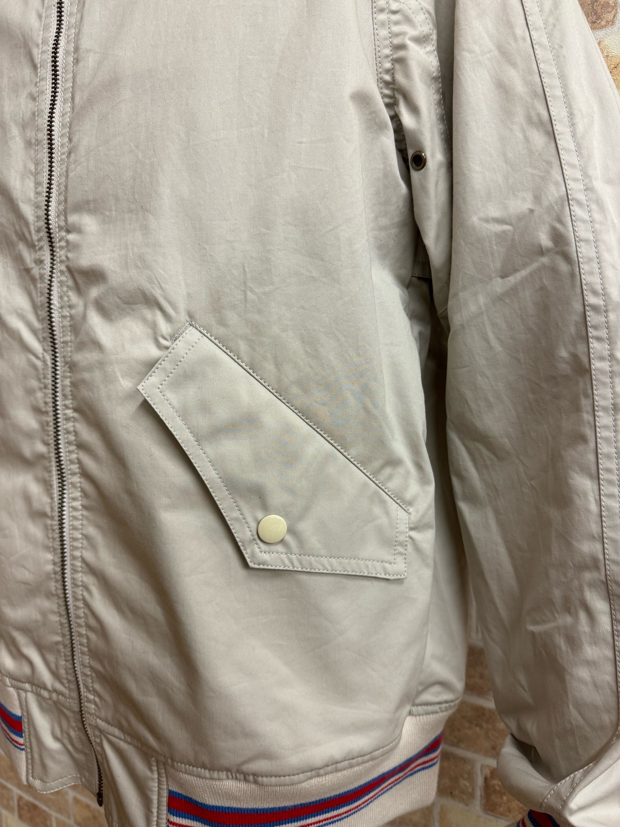 衿・裾・袖口に付けられたポップなストライプが入ったリブが特長の春らしい風合いの高密度のコットンダンプを使用したモッズファッション特有のモンキージャケットです。