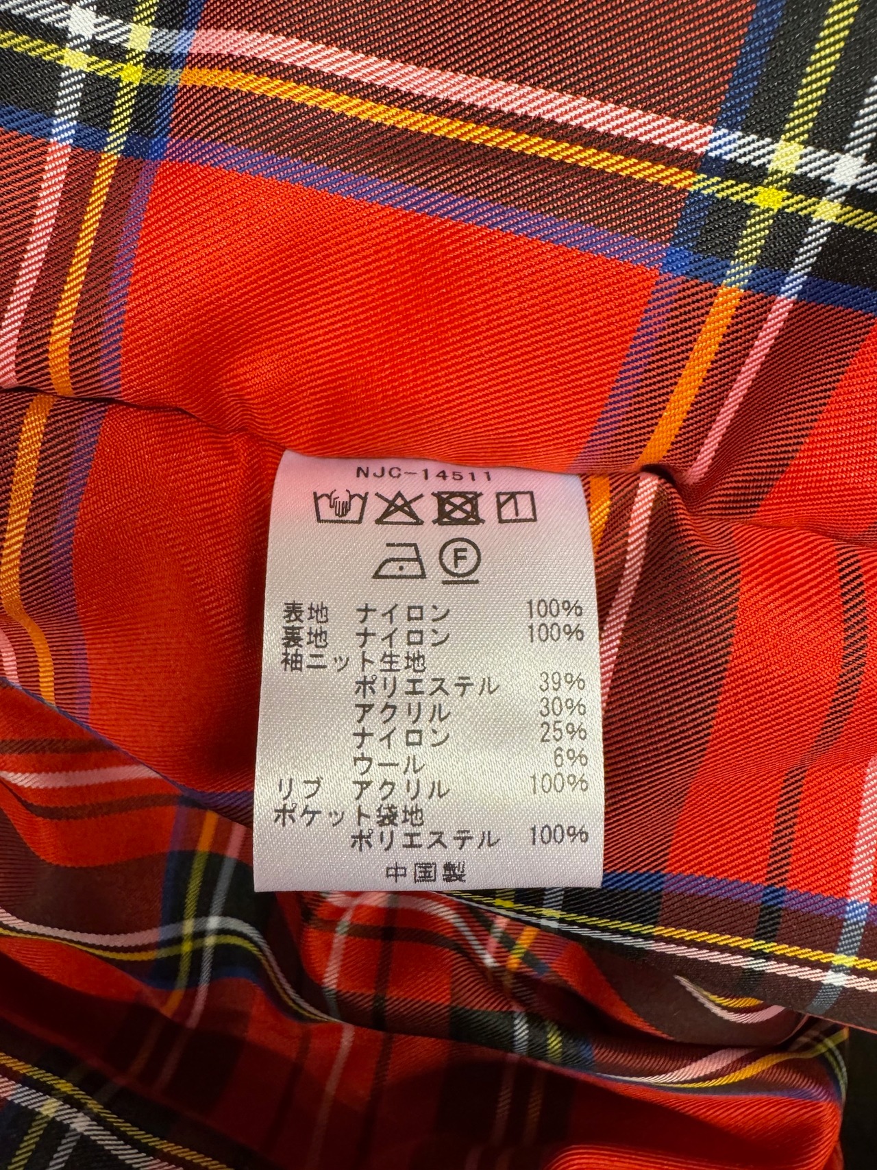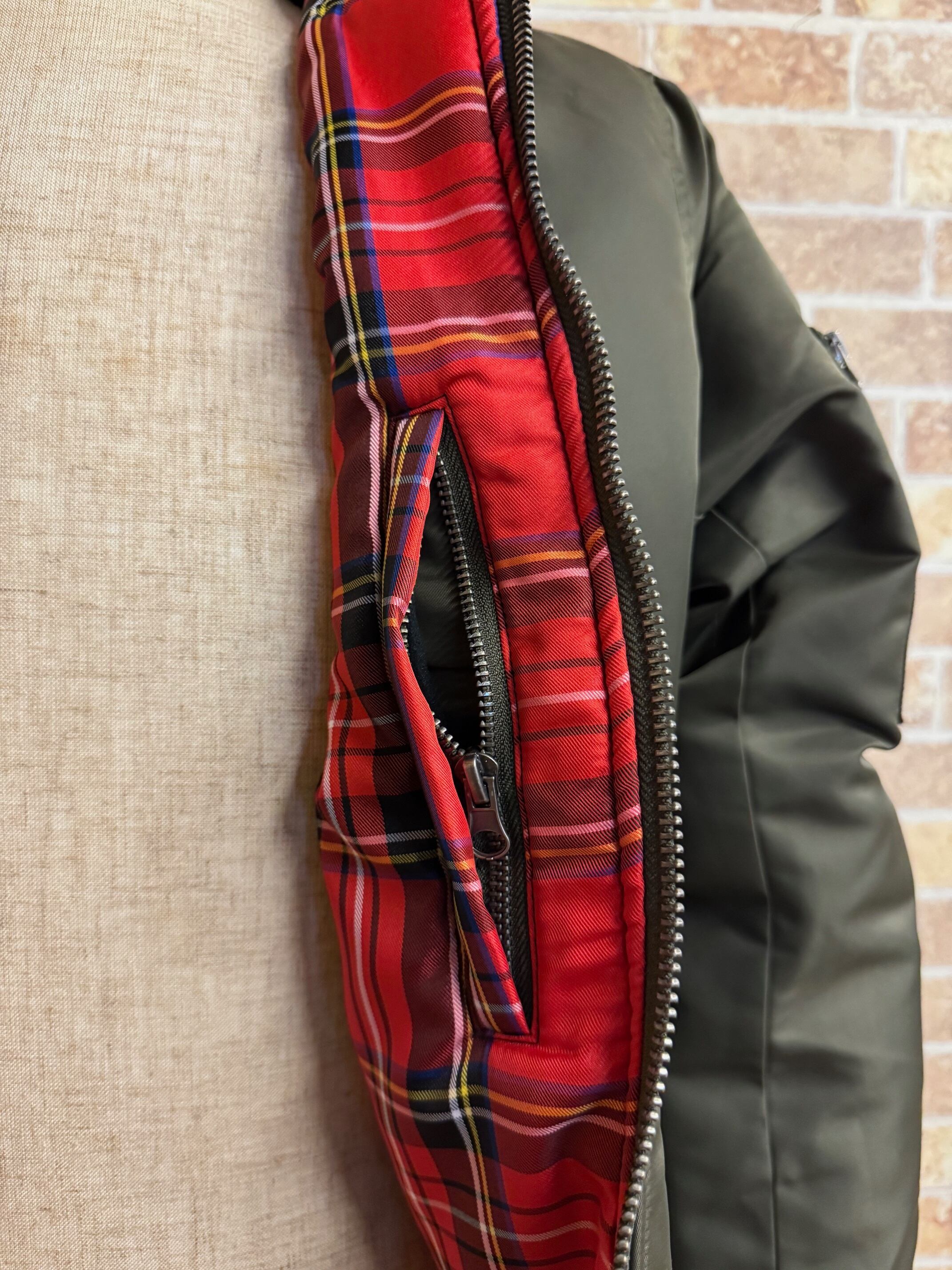 表地は摩擦や雨風に強いタフなヘヴィーナイロンを使用し、裏地はスベリの良いポリエステルのレッドタータンチェック。