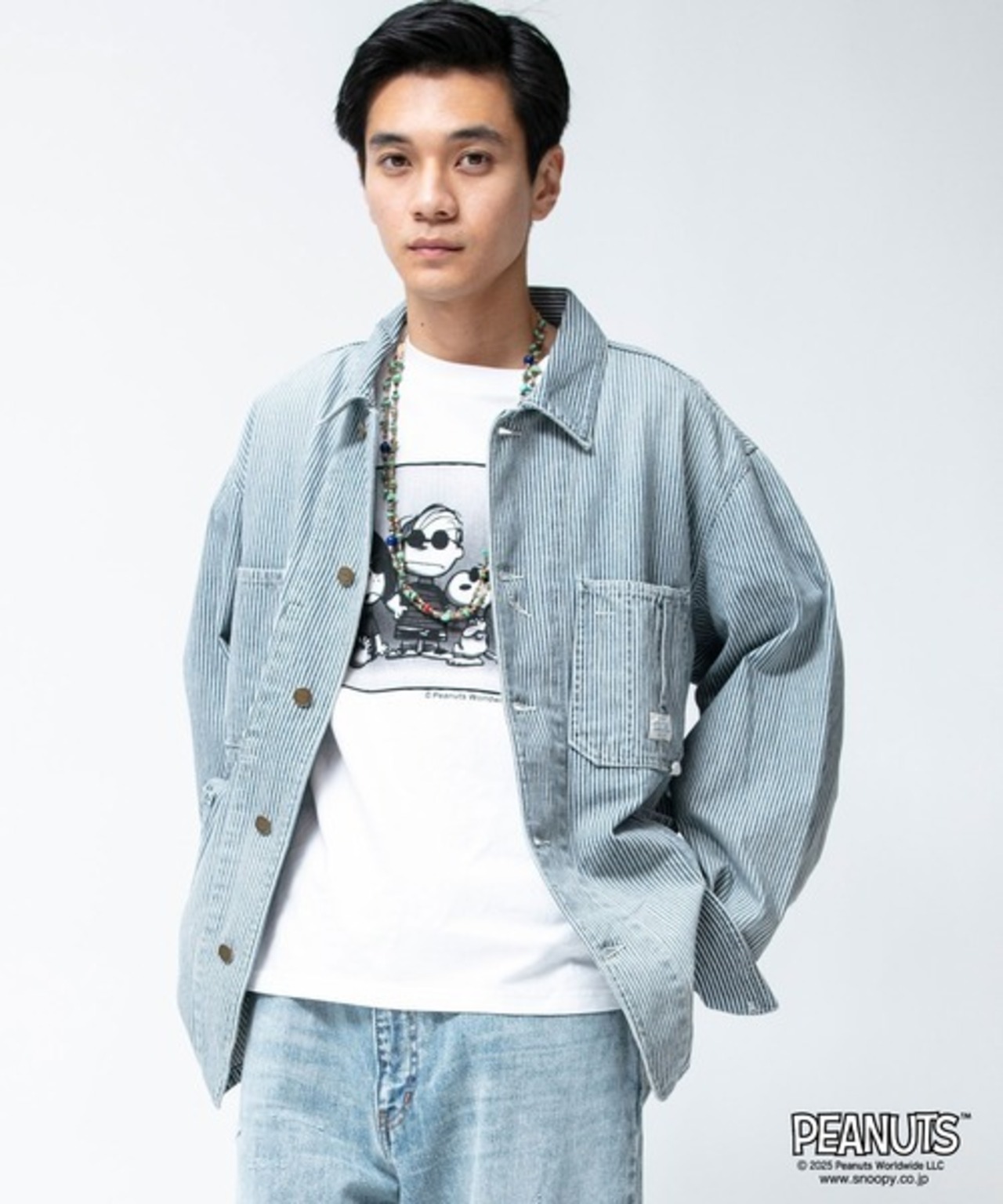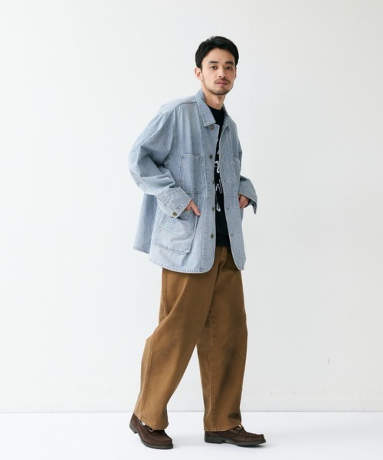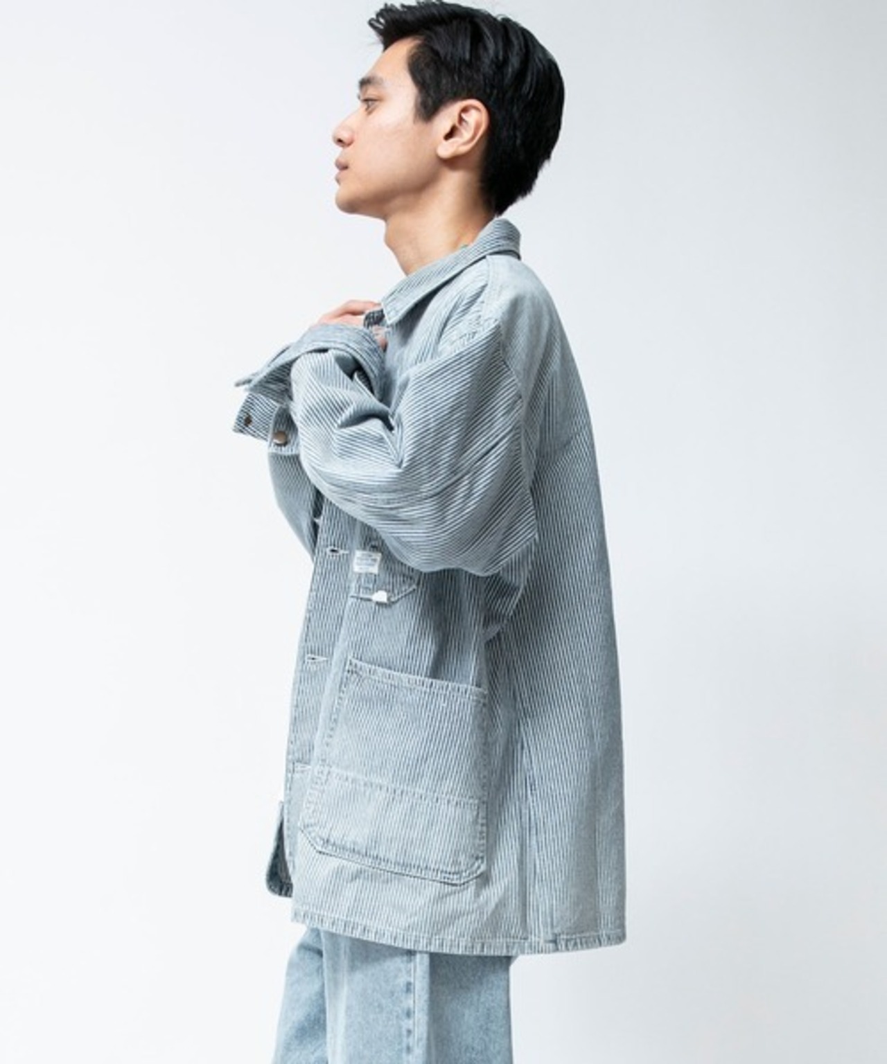 シルエットは、当時のデニムジャケットをベースに、身幅を広く、着丈を短く現代的なボックスタイプにアレンジしています。