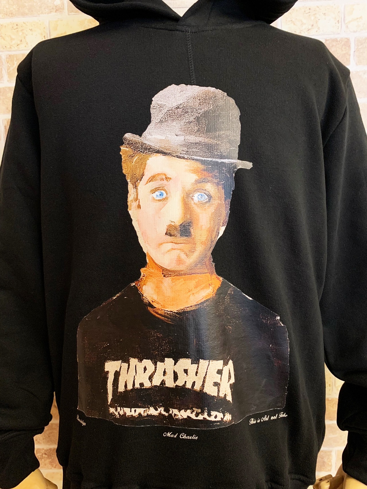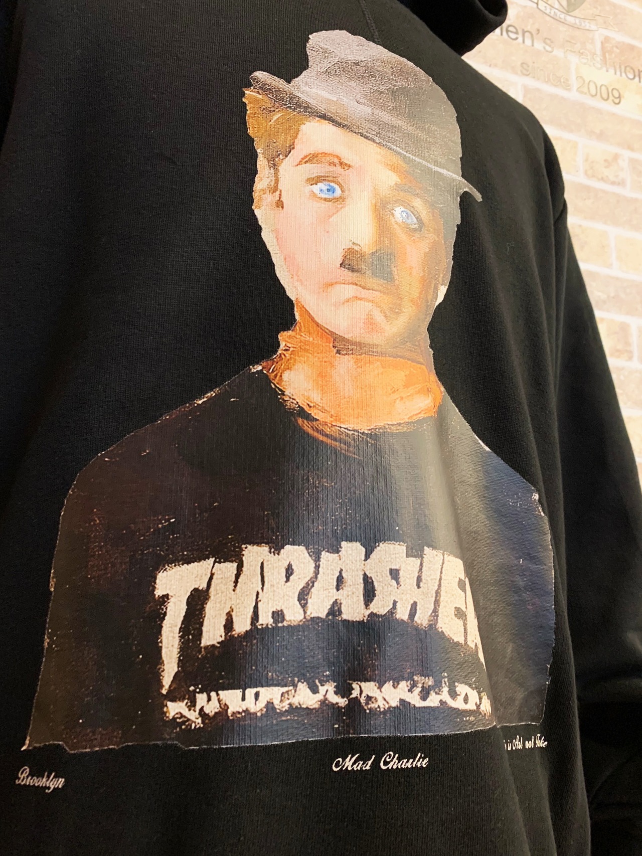 デザインがさらにちょい悪で喜劇王のチャールズ・チャップリンとストリートブランド、スケボーといえばのTHRASHER(スラッシャー)が組み合わさっています。