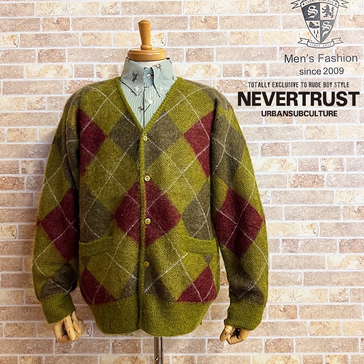 【ネバートラスト】アーガイル・モヘア・カーディガン カラー:カーキ