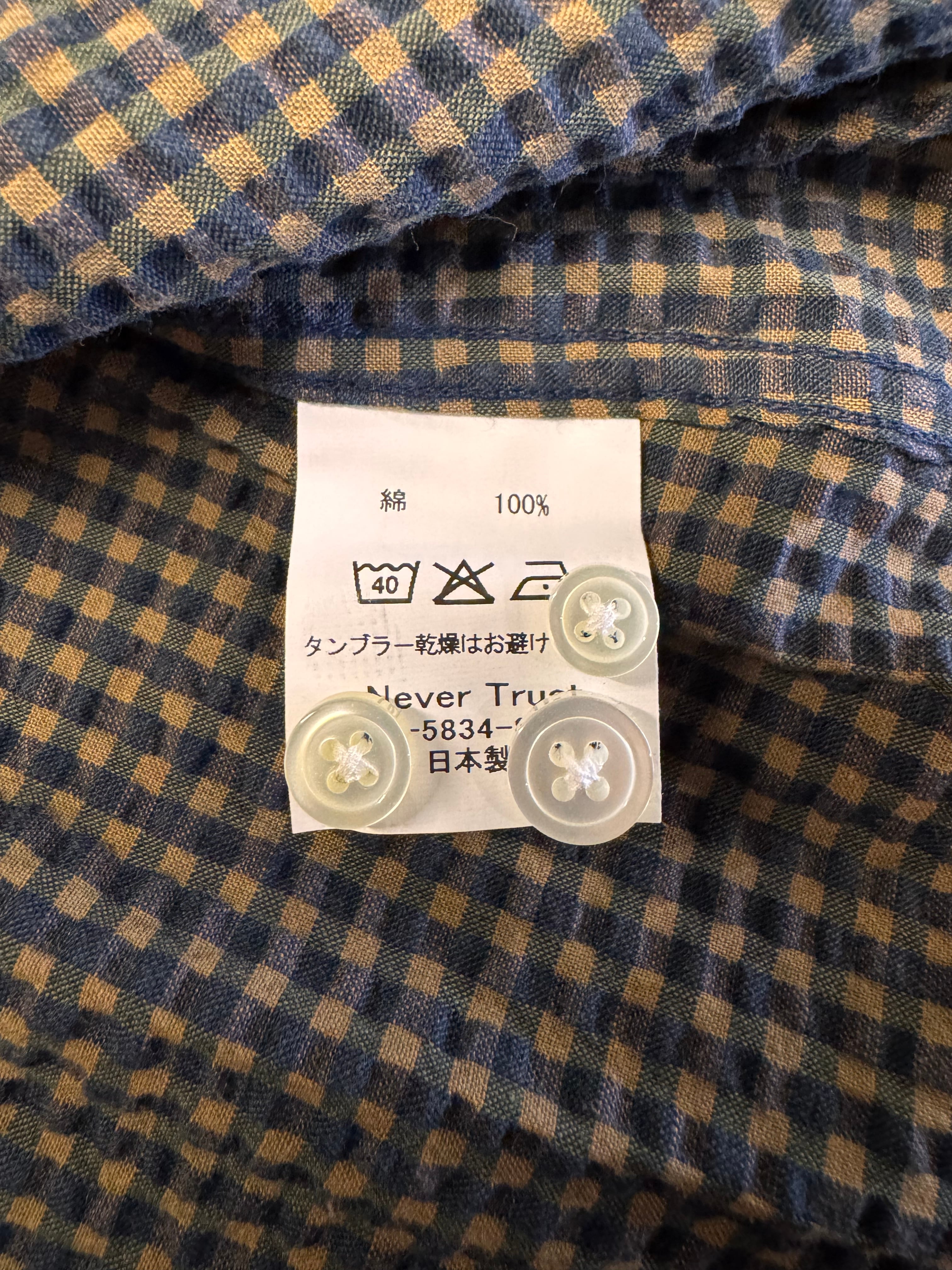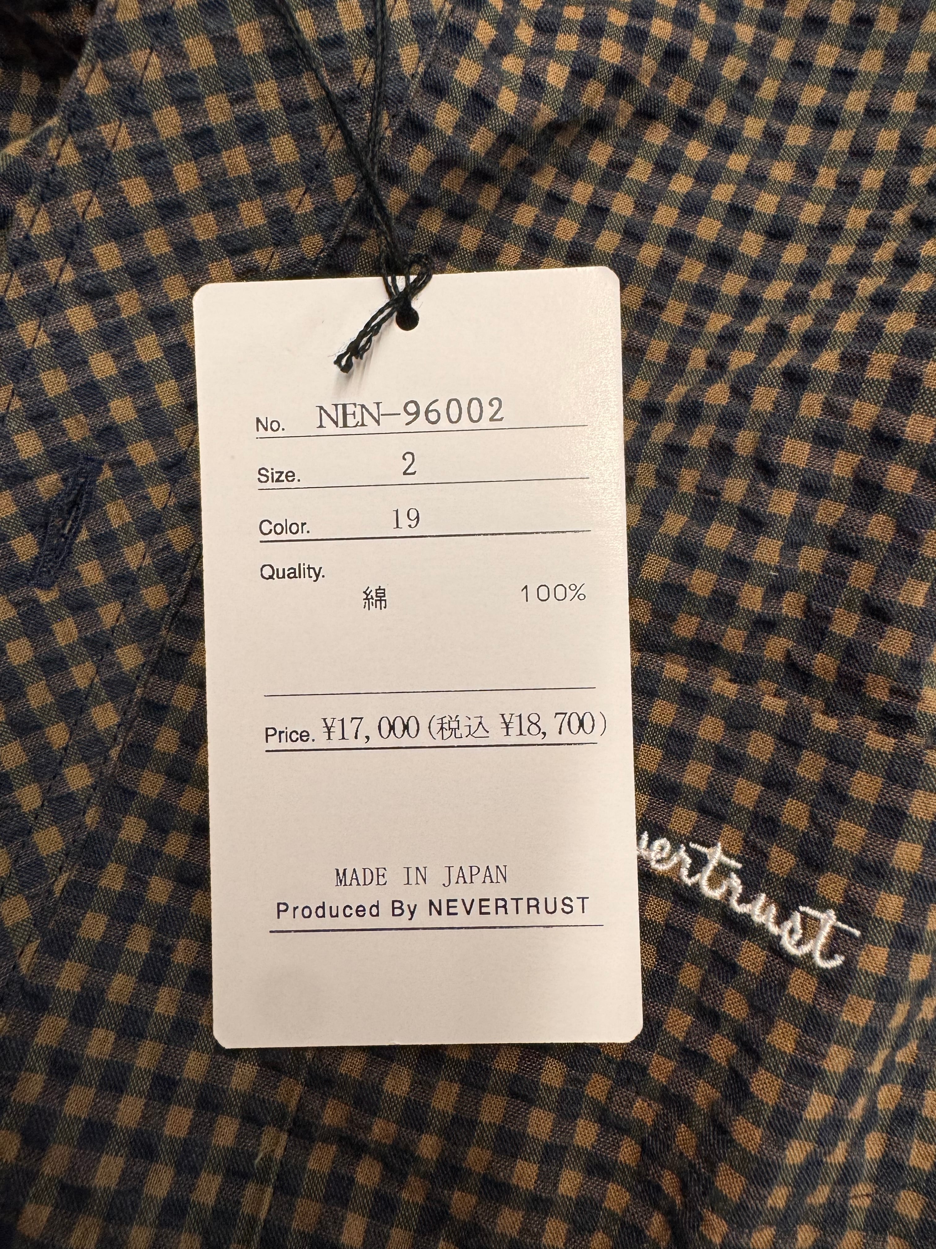 第一ボタンホールはレッドの配色のアクセント。胸ポケットにNevertrust筆記体の刺繍入り。裾脇補強ピース、背ハンガーループ、菱形ネーム台付き。背中はポックスプリーツ仕様。裾の下前にサプ・ネーム付き。
