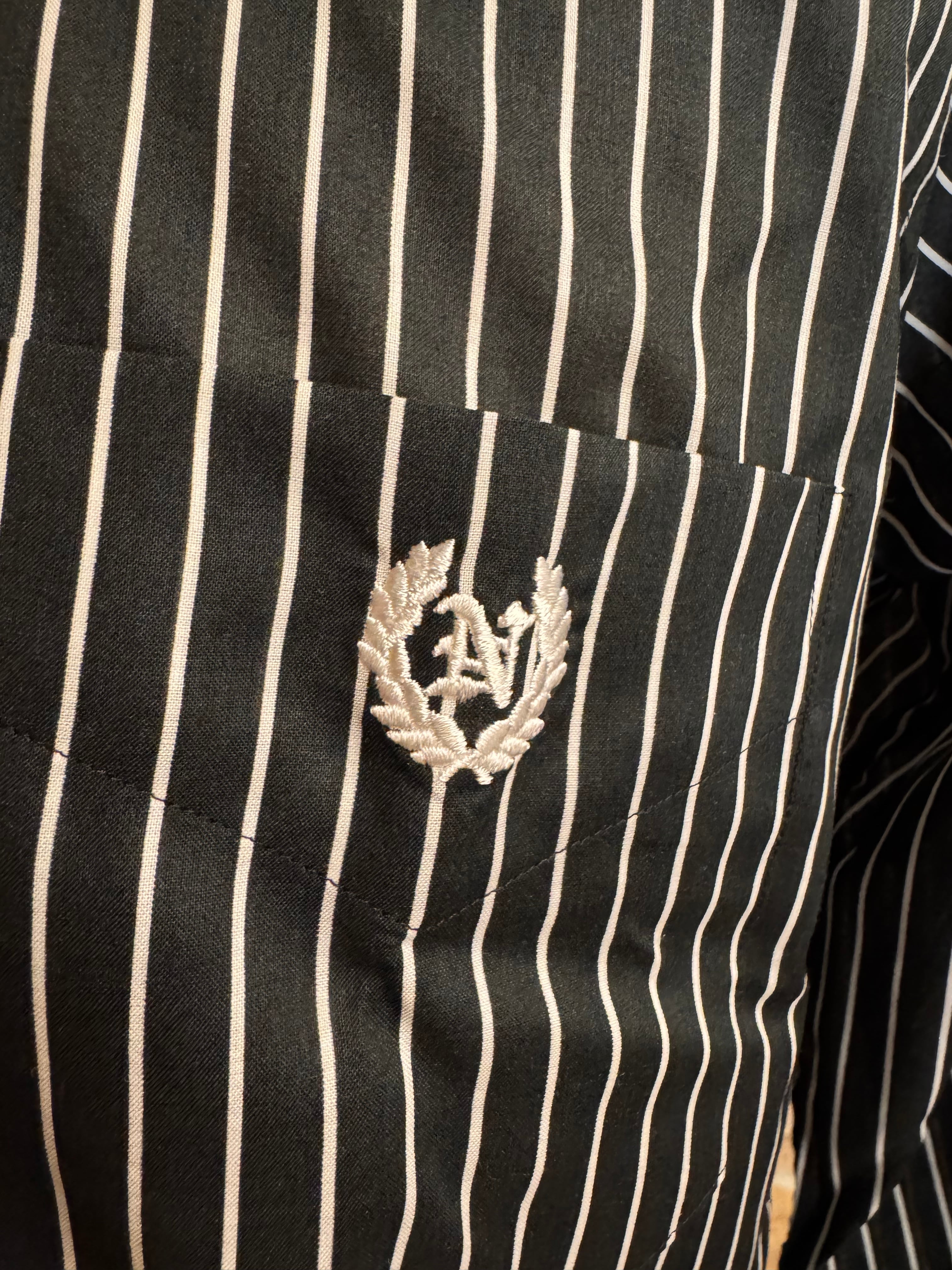 胸ポケットに月桂樹のワンポイント刺繍入り。